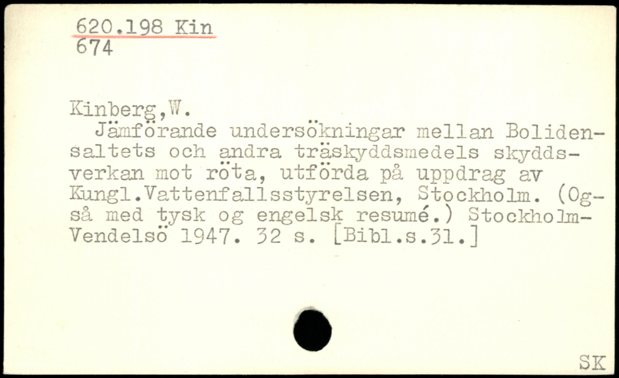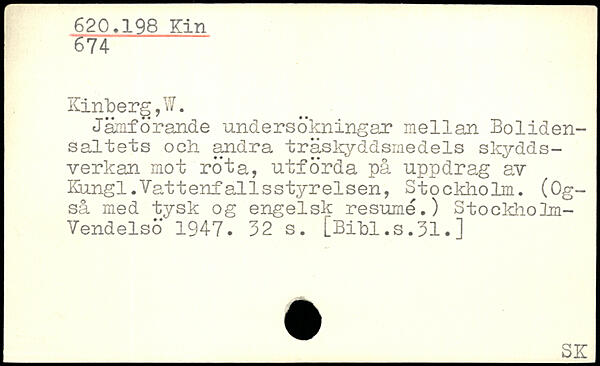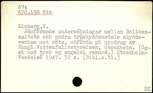 Jämförande undersökningar mellan Boliden-saltets och andra träskyddsmedels skydds-verkan mot röta, utförda på uppdrag av Kiungl.Vattenfallsstyrelsen, Stockholm. (Også med tysk og engelsk resumé.) Stockholm-Vendelsö 1947.