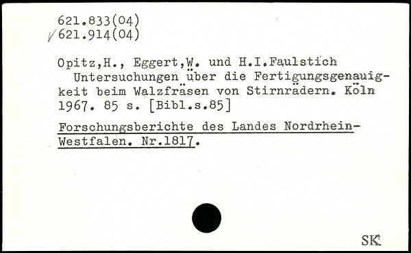 Opitz,H., Eggert,W. und H.I.Faulstich Untersuchungen über die Fertigungsgenauig-keit beim Walzfräsen von Stirnrädern.