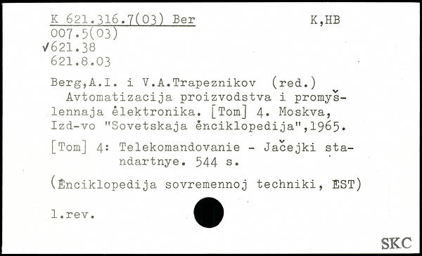 Avtomatizacija proizvodstva i promys-lennaja êlektronika. [Tom] 4, Moskva, Izd-vo "Sovetskaja ênciklopedija",1965. [Tom] 4: Telekomandovanie - Jacejki sta-ndartnye.
