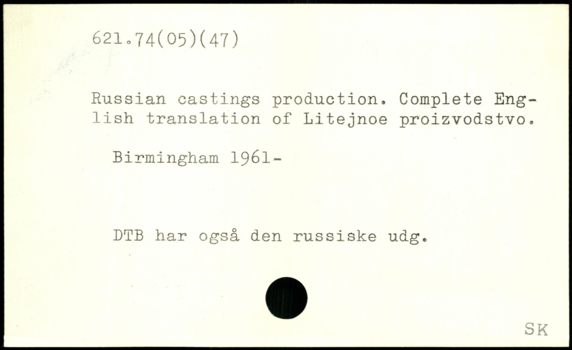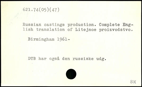 Russian castings production. Complété Eng-; lish translation of Litejnoe proizvodstvo. Birmingham 1961- DTB har også den russiske udg.