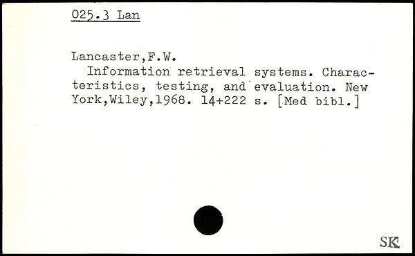 Information retrieval systems. Characteristics, testing, and’evaluation.