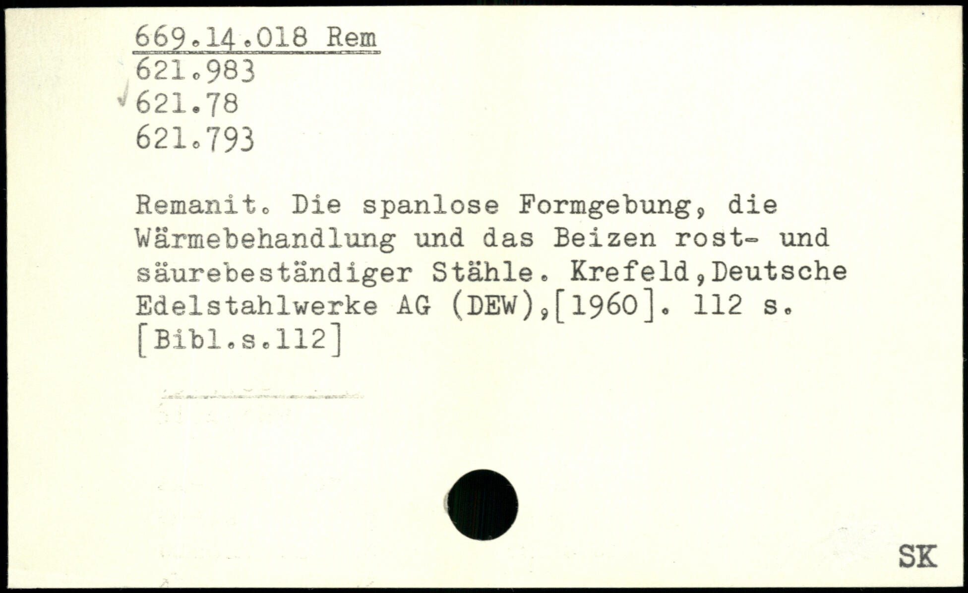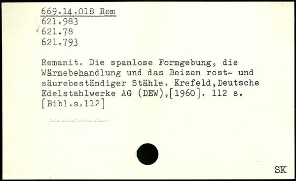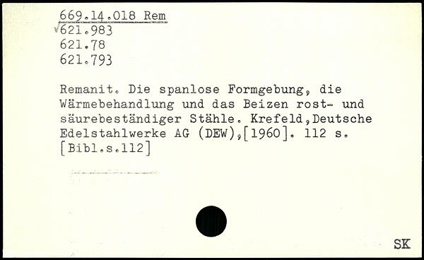 Remanit. Die spanlose Formgebung, die Wärmebehandlung und das Beizen rost- und säurebeständiger Stähle. Krefeld,Deutsche Edelstahlwerke AG (DEW),[1960].