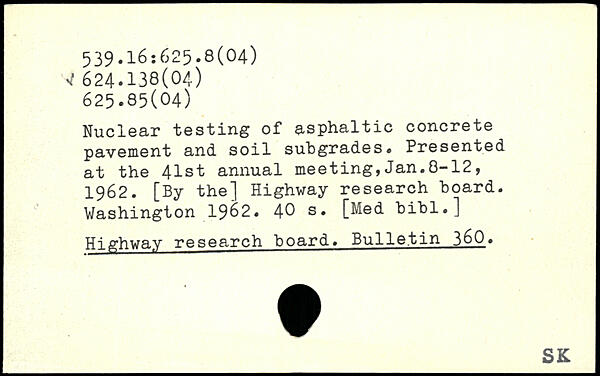 Nuclear testing of asphaltic concrete pavement and soil subgrades# Presented at the 41si annual meeting,Jan.8-12, 1962. [By the] Highway research board.