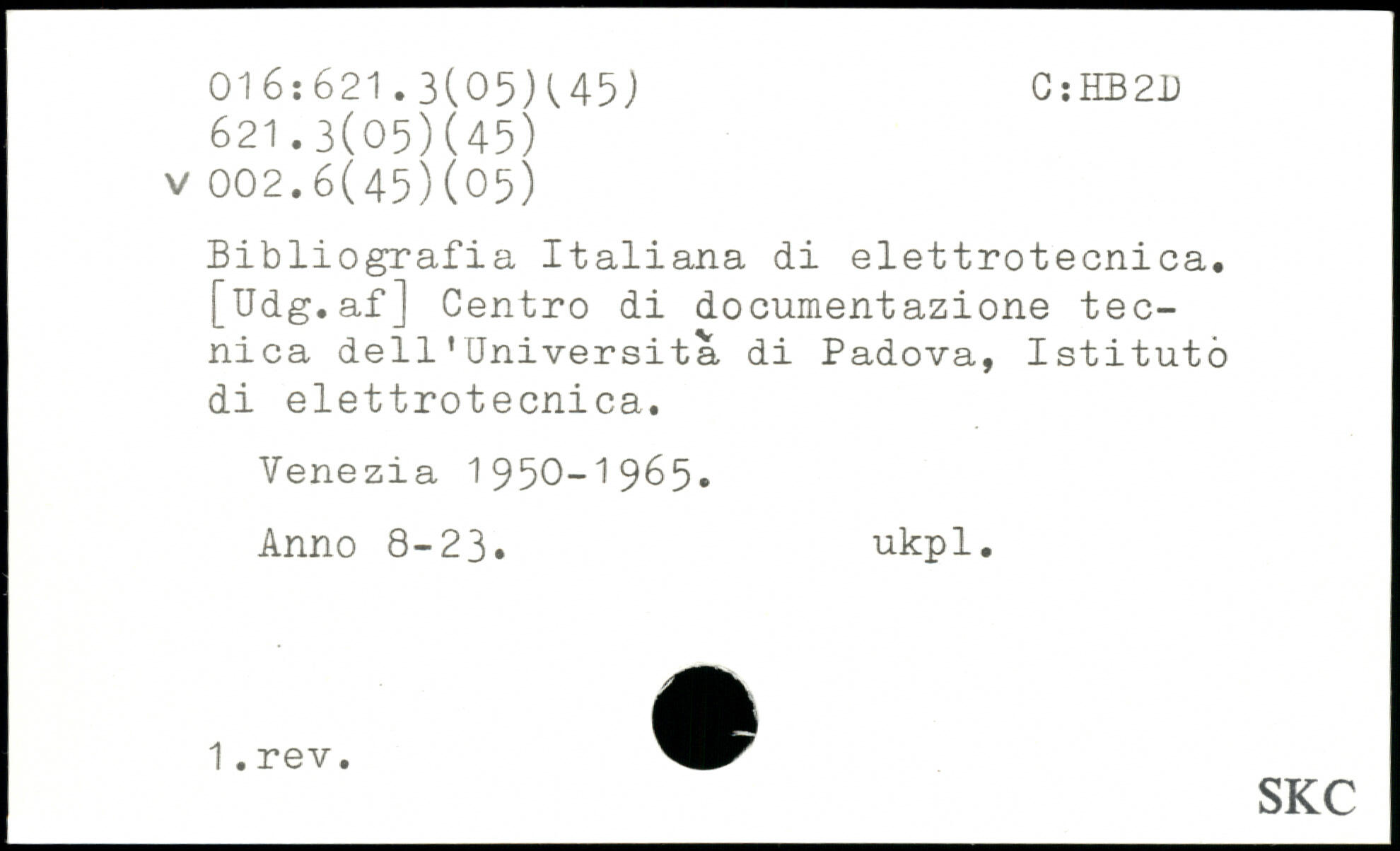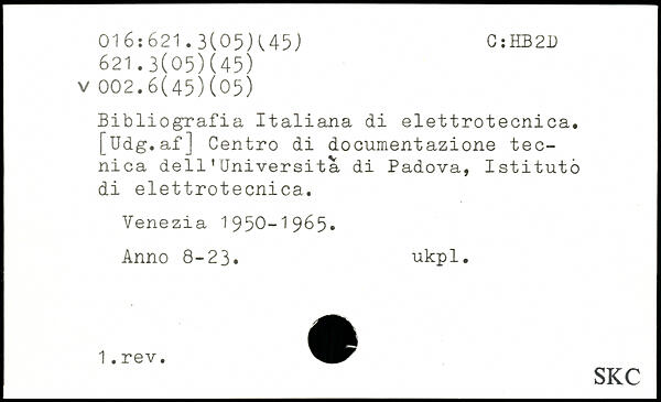 Bibliografia Italiana di elettrotecnica. [Udg.af] Centro di documentazione tec-nica dell1Universita di Padova, Istitutb di elettrotecnica. Venezia 1950-1965, Anno 8-23, ukpl.