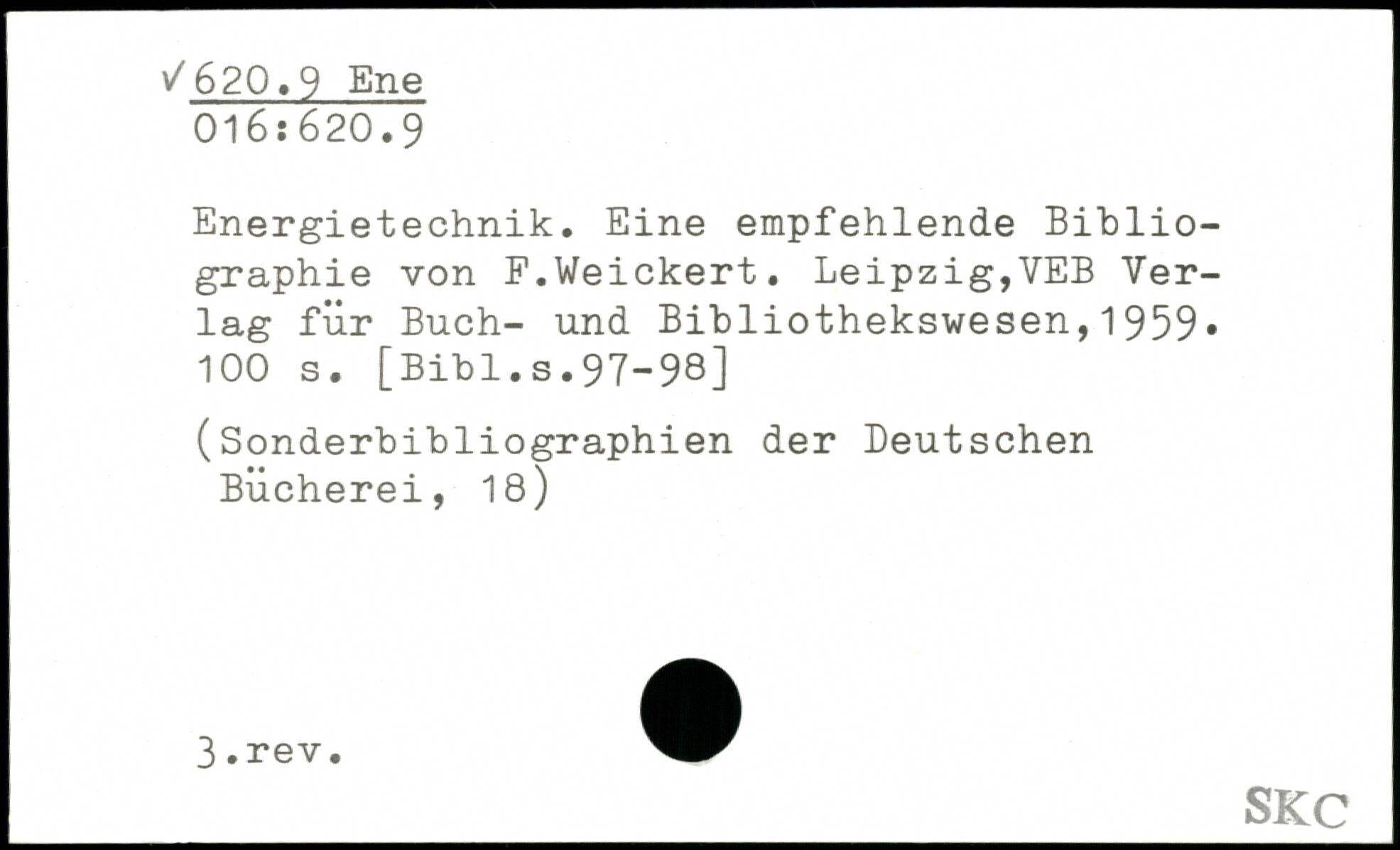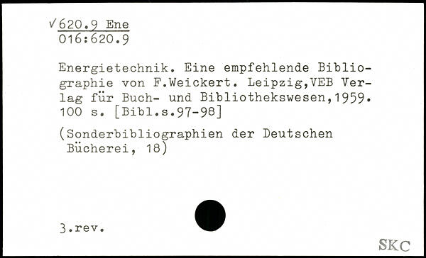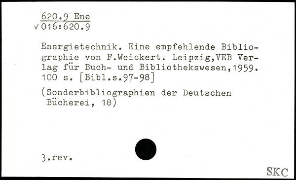 Energietechnik. Eine empfehlende Bibliographie von F.Weickert. Leipzig,VEB Verlag für Buch- und Bibliothekswesen,1959.
