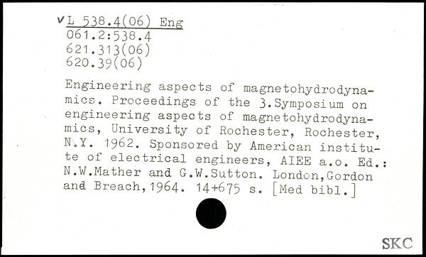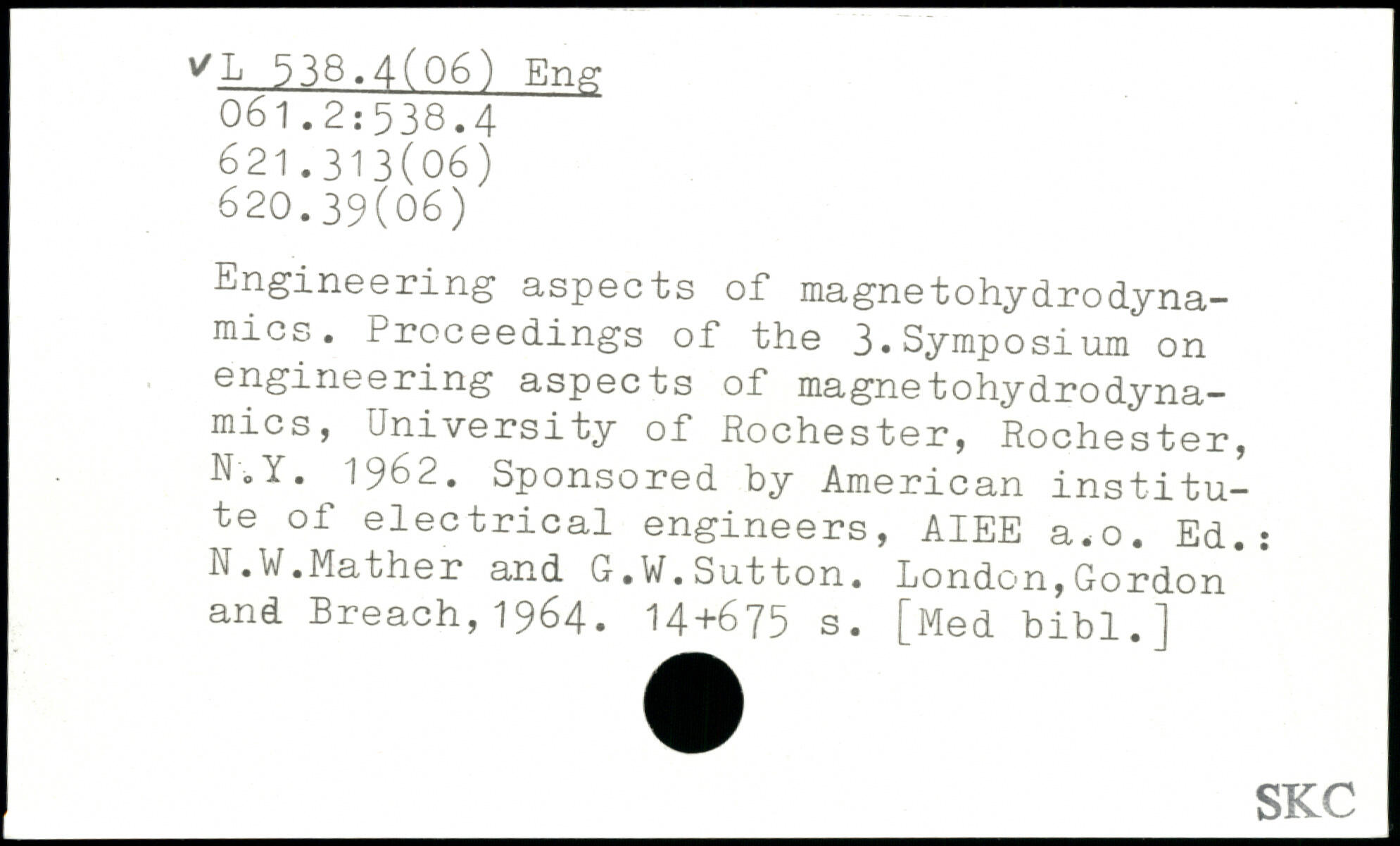 Engineering aspects of magnetohydrodyna-niics. Proceedings of the 3. Symposium on engineering aspects of magnetohydrodyna-mics, University of Rochester, Rochester, N.Y. 1962. Sponsored by American institute of electrical engineers, AIEE a.o. Ed.: N.W.Mather and G.W.Sutton.