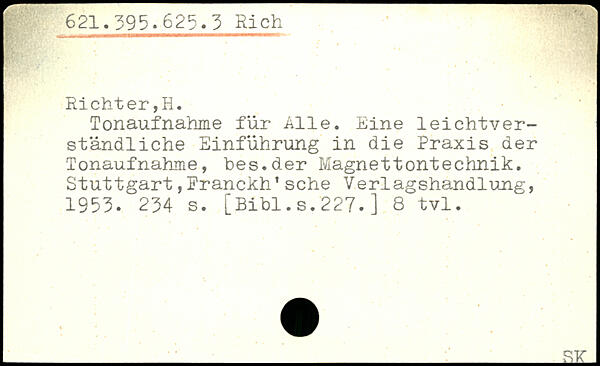 Tonaufnahme für Alle. Eine leichtverständliche Einführung in die Praxis der Tonaufnahme, bes.der Magnettontechnik. Stuttgart,Pranckh’sehe Verlagshandlung, 1953-