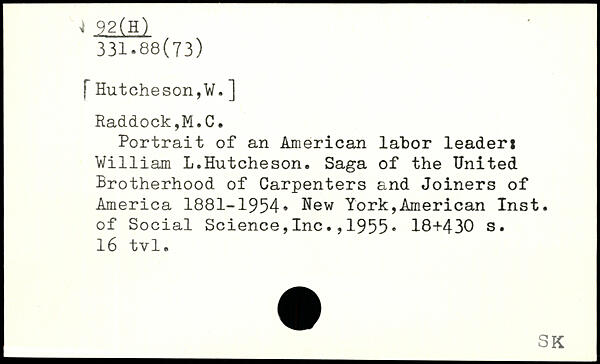 Portrait of an American labor leader. W1111am L.Hutcheson. Saga of the United Brotherhood of Carpenters and Joiners of America 1881-1954, New York,American Inst, of