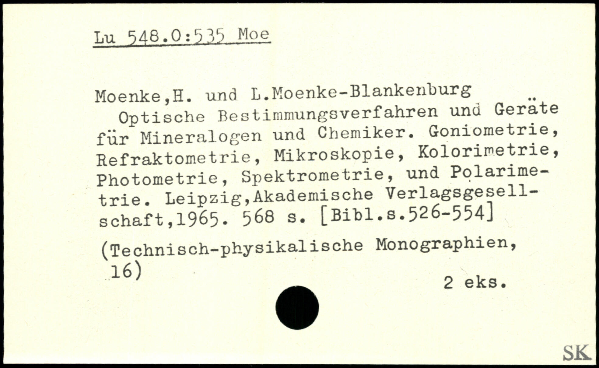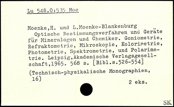 Optische Bestimmungsverfahren und Gerate für Mineralogen und Chemiker. Goniometrie, Refraktometrie, Mikroskopie, Kolorimetrie, Photometrie, Spektrometrie, und Polarimetrie.