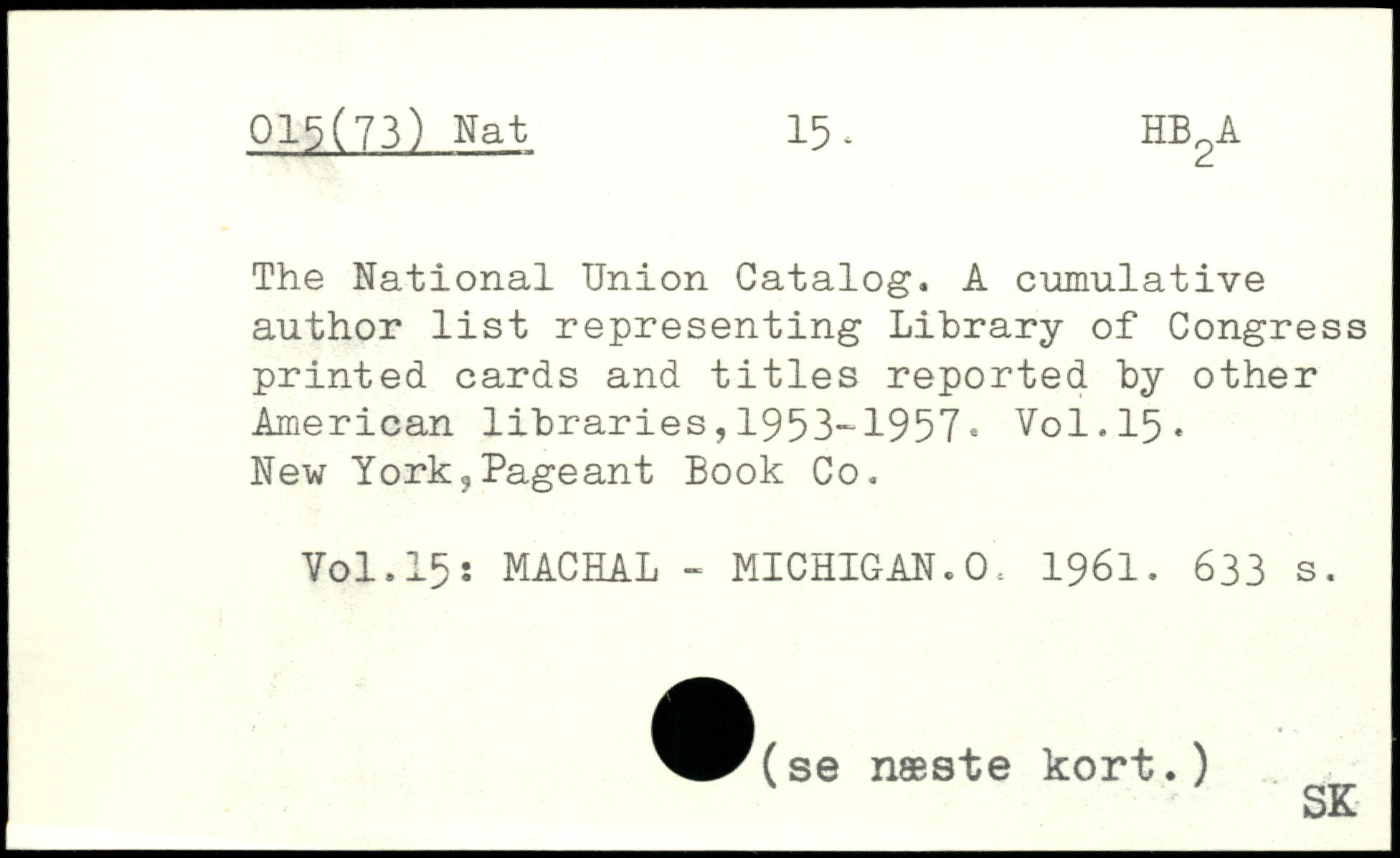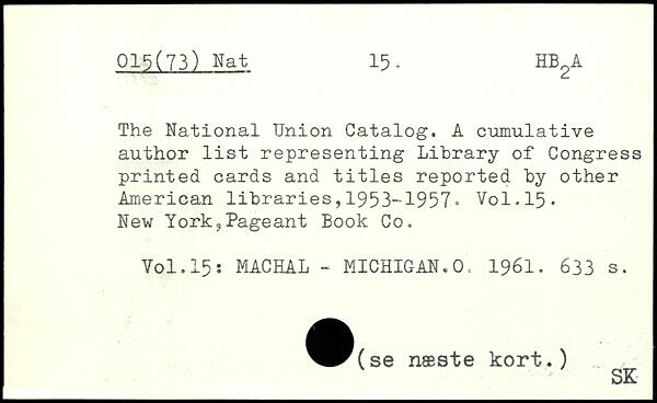 The National Union Catalog. A cumulative author list representing Library of Congress printed cards and titles reported by other American libraries,1953-1957, V0I.I5, New York,Pageant Book Co. Yol.15: MACHAL - MICHIGAN.0. 1961.