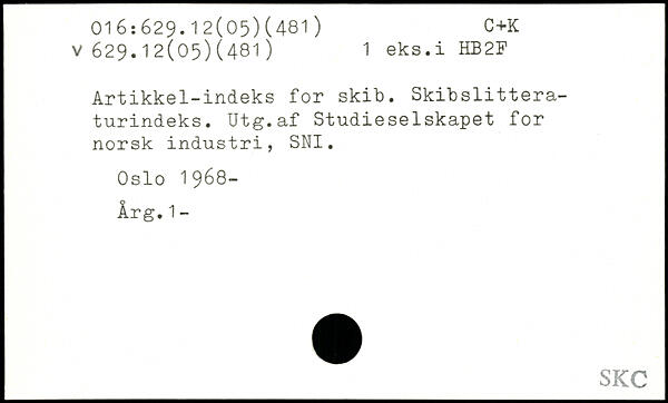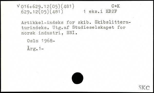 Artikke1-indeks for skib. Skibslitteraturindeks. Utg.af Studieselskapet for norsk industri, SNI. Oslo 1968- Årg.1-