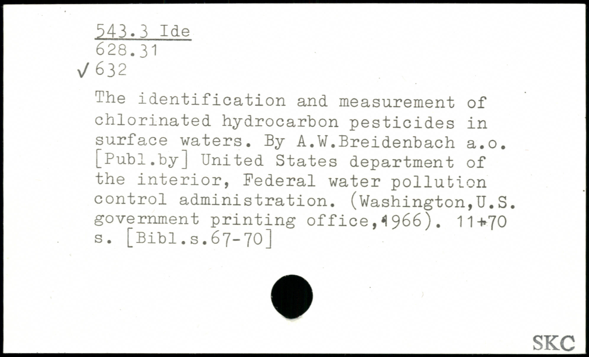 The identification and measurement of chlorinated hydrocarbon pesticides in surface waters. By A.W.Breidenbach a.o.