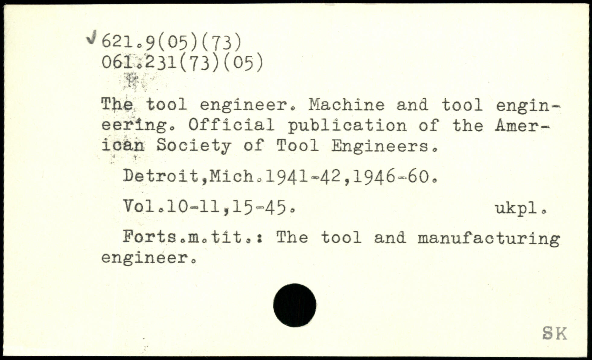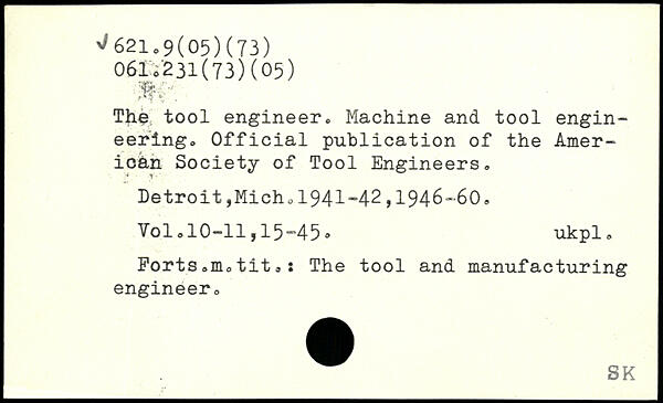 The; tool engineer. Machine and tool engineering. Official publication of the American Society of Tool Engineers. Detroit,Micho1941"42,1946-60.