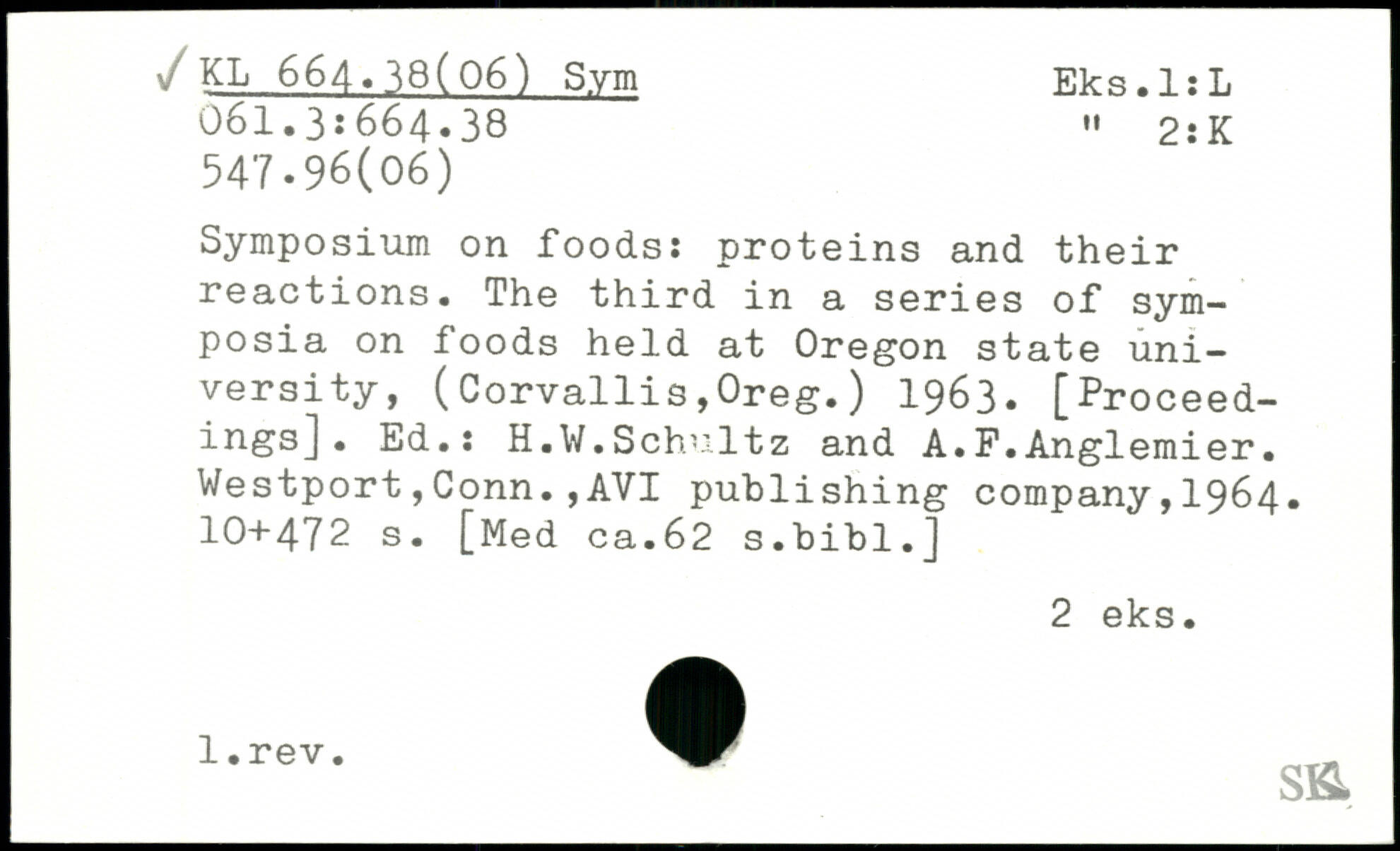 Symposium on foods: proteins and their reactions. The third in a series of symposia on foods held at Oregon state university, (Corvallis,Oreg.) 1963. [Proceedings]. Ed.: H.W.Schultz and A.F.Anglemier.