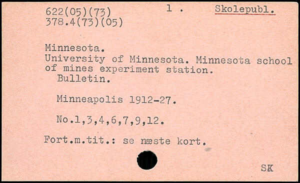 University of Minnesota. Minnesota school of mines experiment station. Bulletin. Minneapolis 1912-27. No.1,3,4,6,7,9,12. Port.m.tit.: se næste kort.