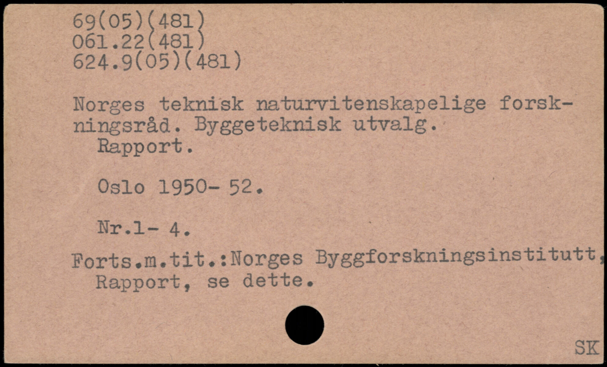Norges teknisk na turvitens kapelige forskningsråd. Byggeteknisk utvalg. Rapport. Oslo 1950- 52. Nr.l- 4. Forts.m.tit.sNorges Byggforskningsinstitutt, Rapport, se dette. _^_SK