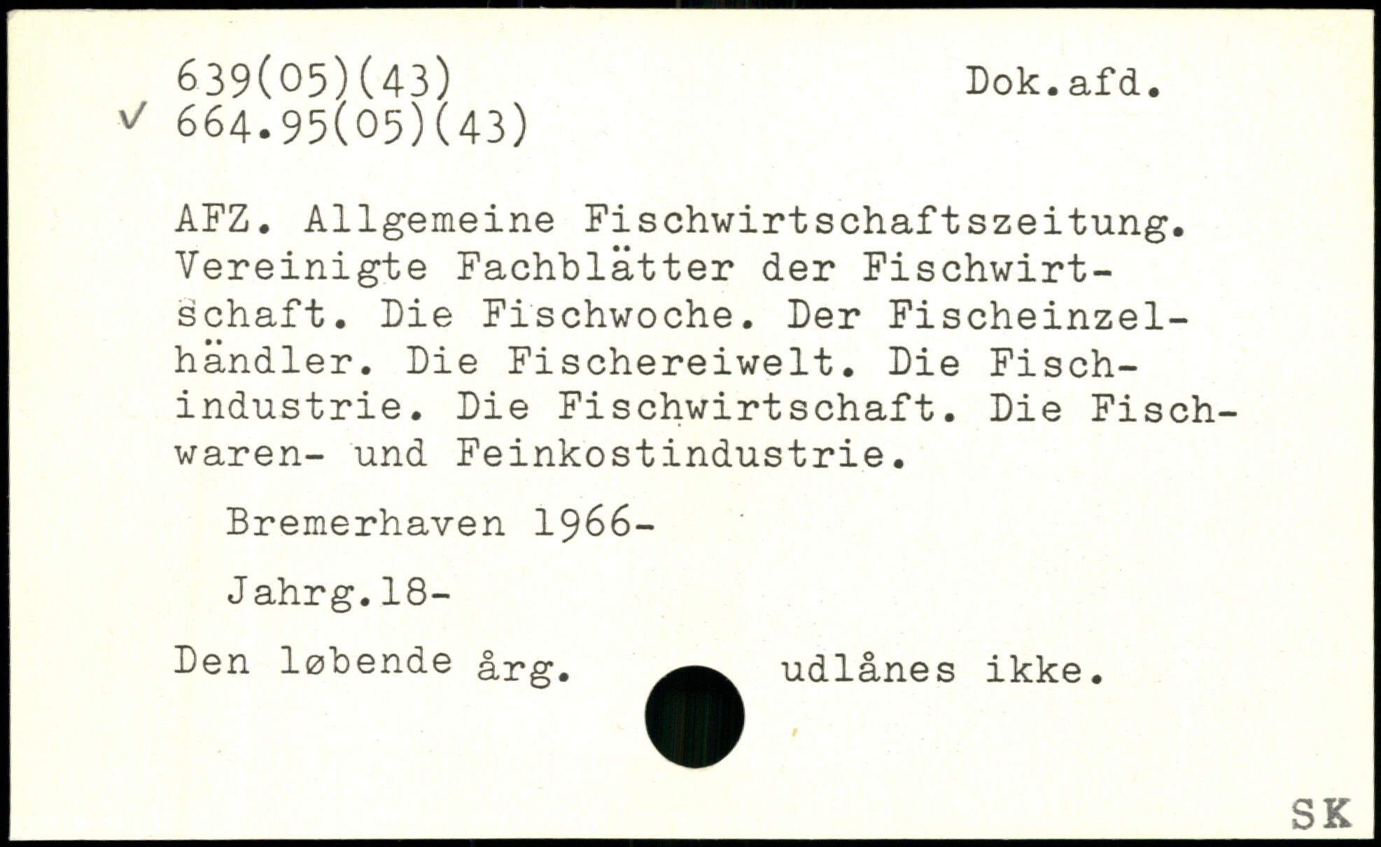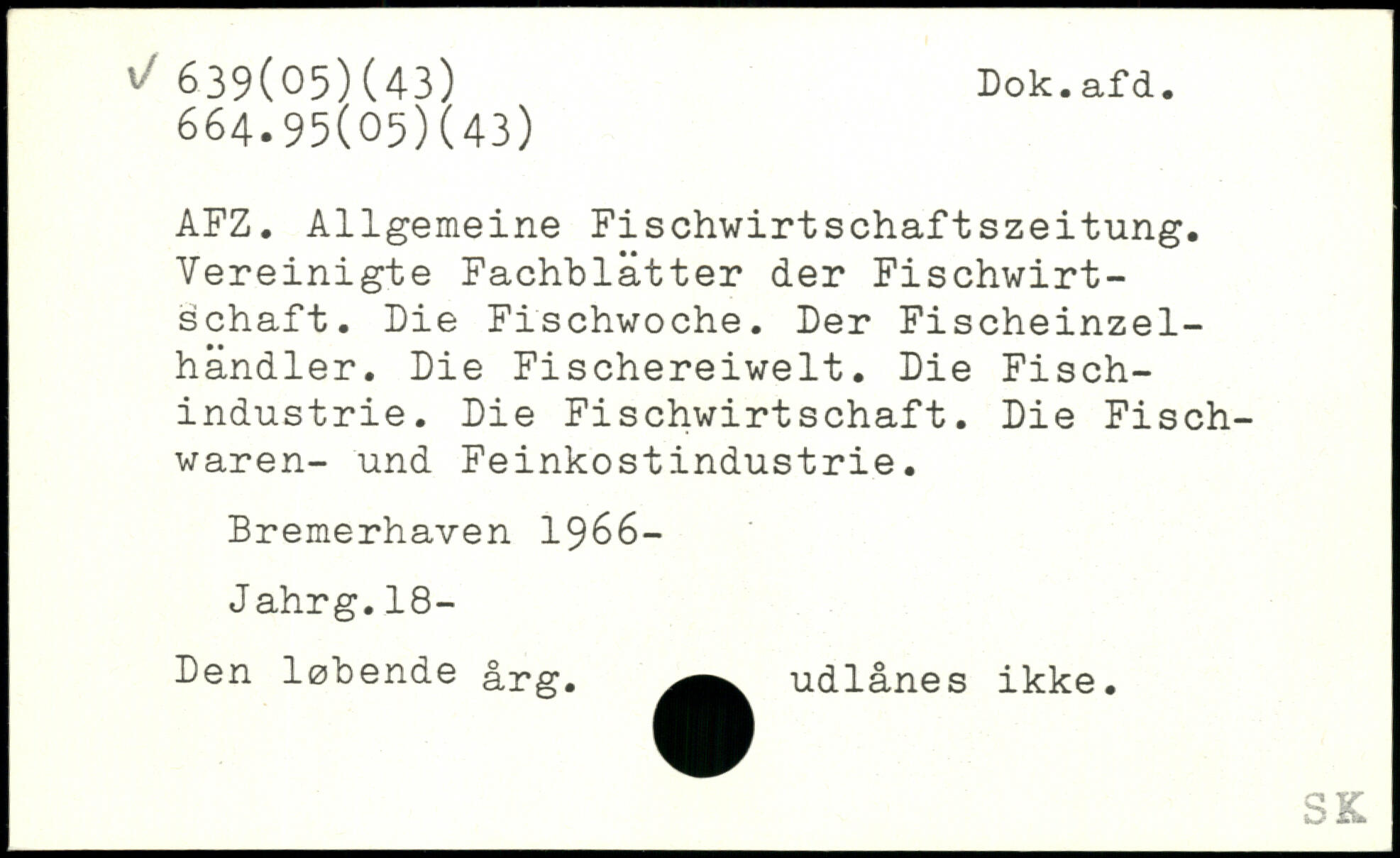 AFZ. Allgemeine Fischwirtschaftszeitung. Vereinigte Fachblätter der Fischwirtschaft. Die Fischwoche. Der Fischeinzelhändler. Die Fischereiwelt. Die Fischindustrie. Die Fischwirtschaft. Die Fischwaren- und Feinkostindustrie. Bremerhaven 1966- Jahrg.18- Den løbende årg. udlånes ikke.