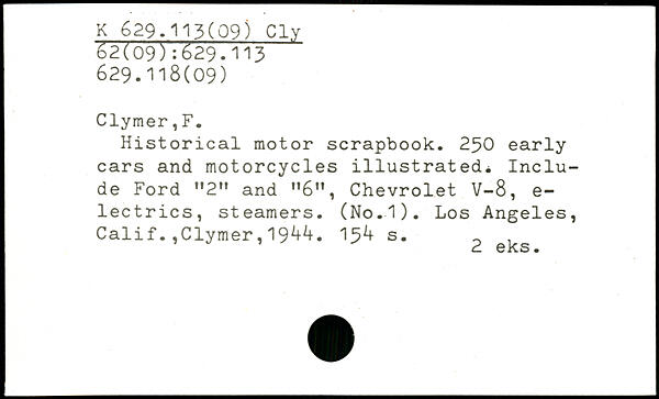 Historical motor scrapbook. 250 early cars and motorcycles illustrated. Include Ford ,f2M and "6", Chevrolet V-8, e-lectrics, steamers. (No.1). Los Angeles, CalifClymer,19^^. 15^ s. 6KS.