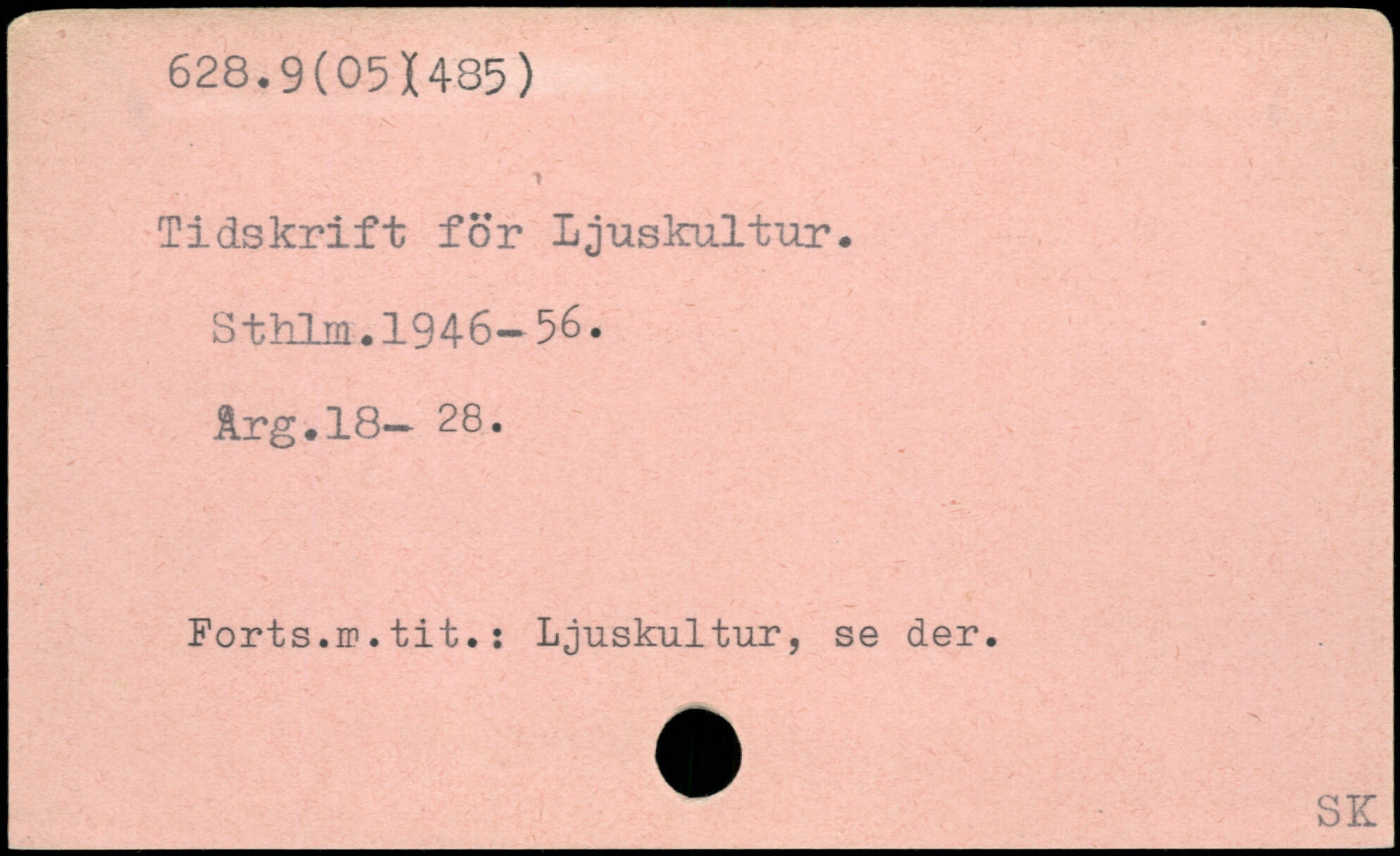 Tidskrift för Ljuskultur. StifLm.1946— 56. Ärg.18— 28. Forts.ir. tit. ; Ljuskultur, se der.