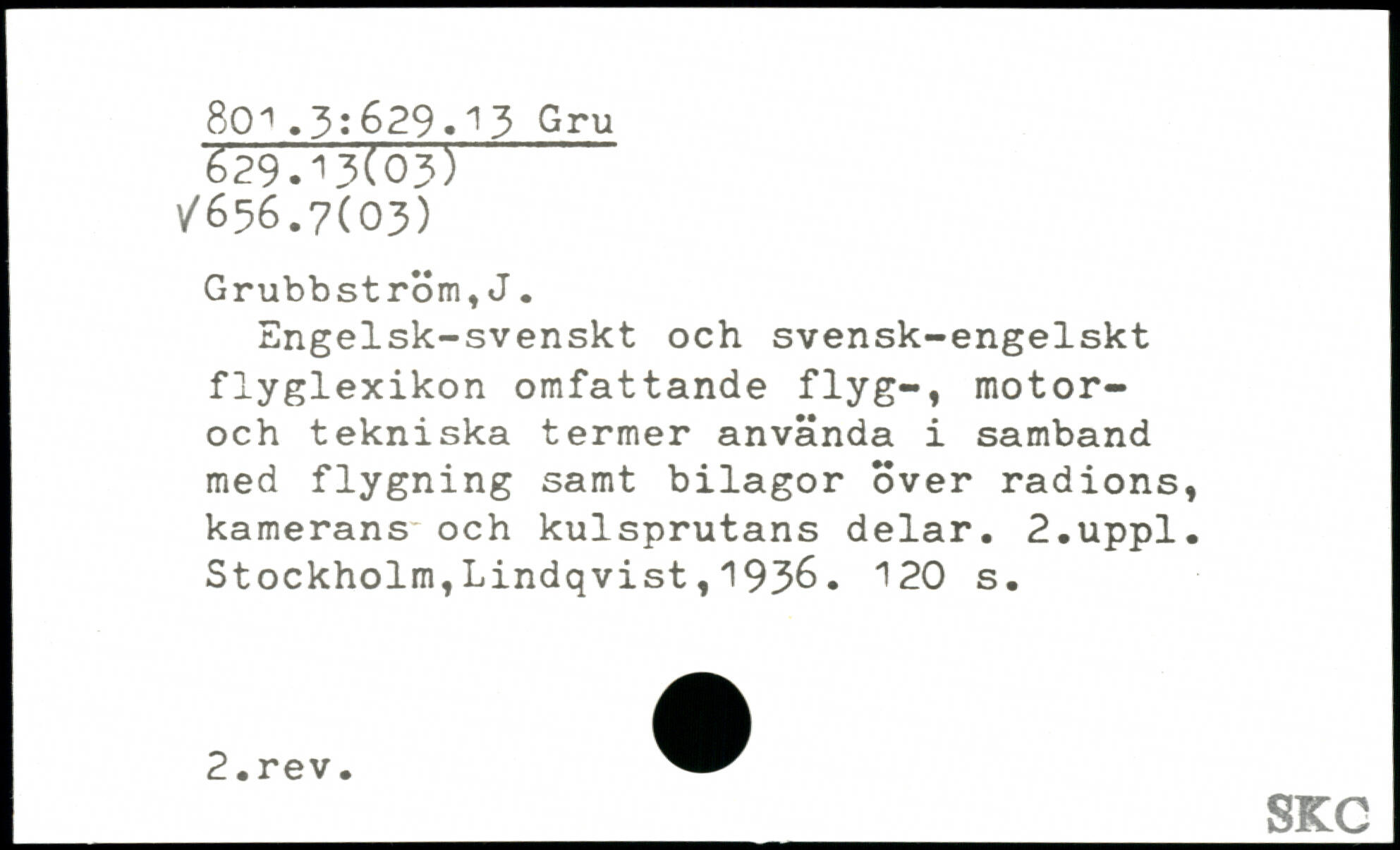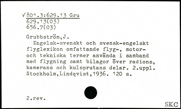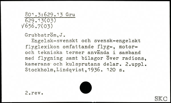 Engelsk-svenskt och svensk-engelskt flyglexikon omfattande flyg-, motor-och tekniska termer använda i samband med flygning samt bilagor över radions, kamerans och kulsprutans delar.