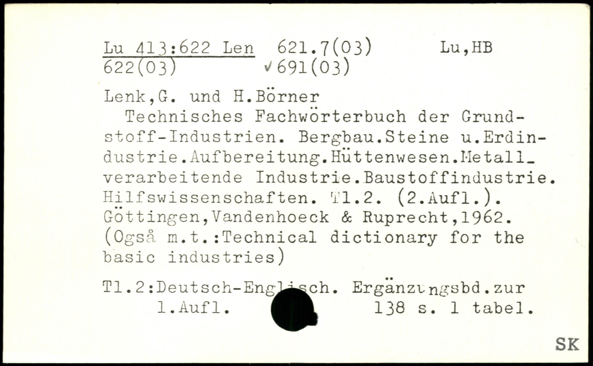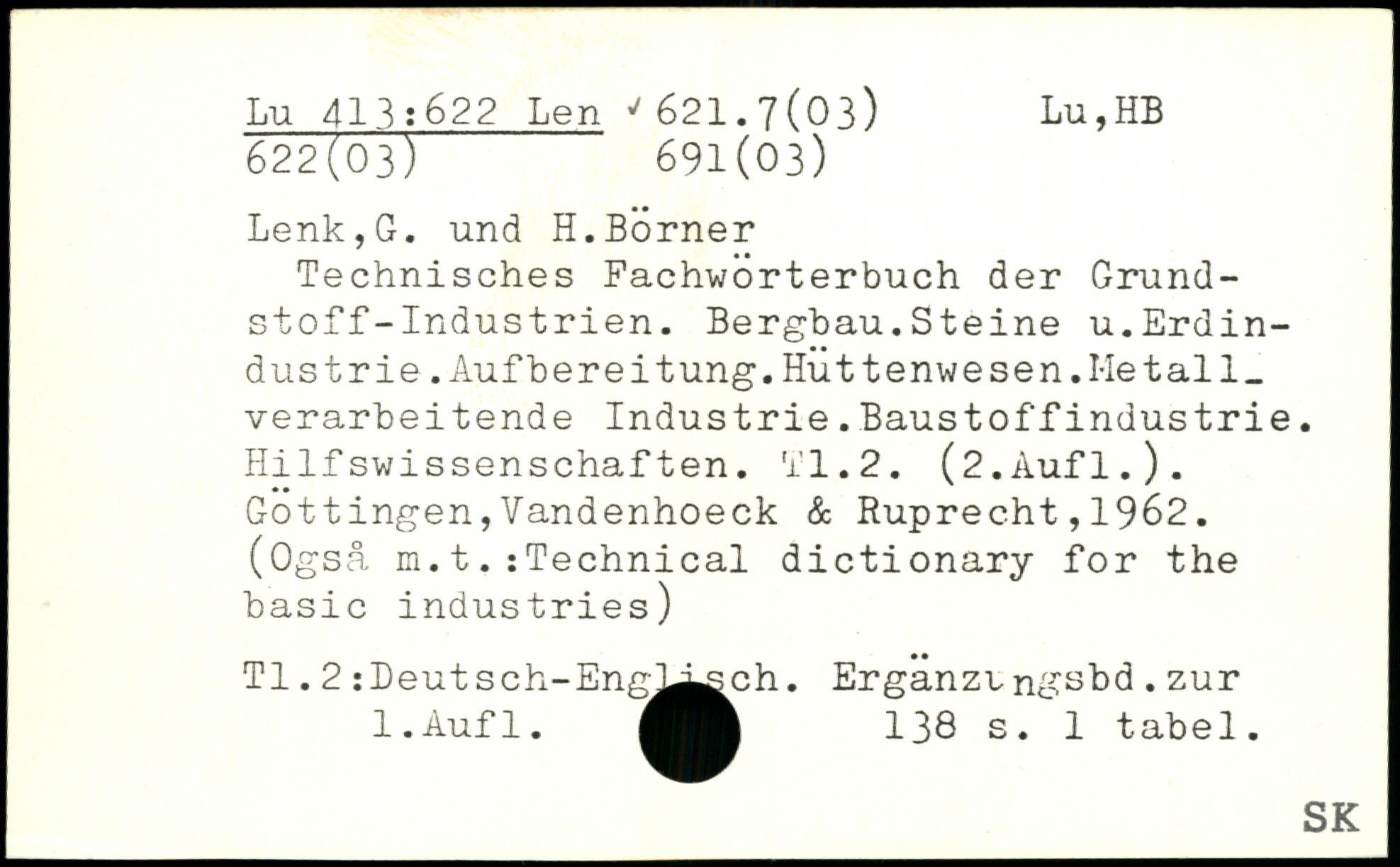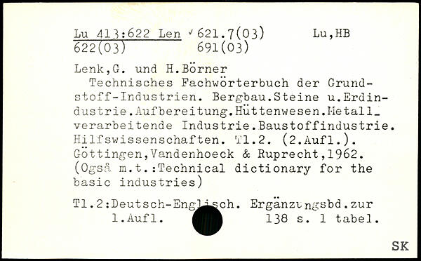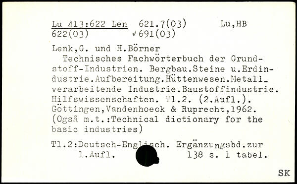 Technisches Fachwörterbuch der Grundstoff-Industrien. Bergbau.Steine u.Erdindustrie .Aufbereitung.Huttenwesen.Metall, verarbeitende Industrie.Baustoffindustrie. Hilfswissenschaften. TI.2. (