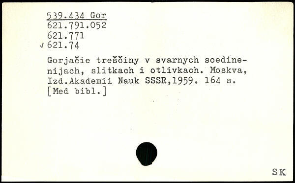 Gorjacie tresciny v svarnych soedine-nijach, slitkach i otlivkach. Moskva, Izd.Akademii Nauk SSSR,1959, I