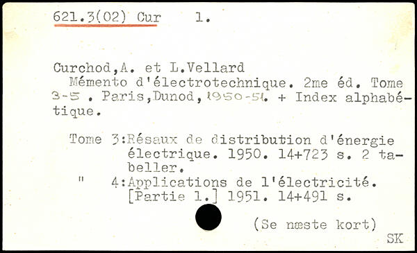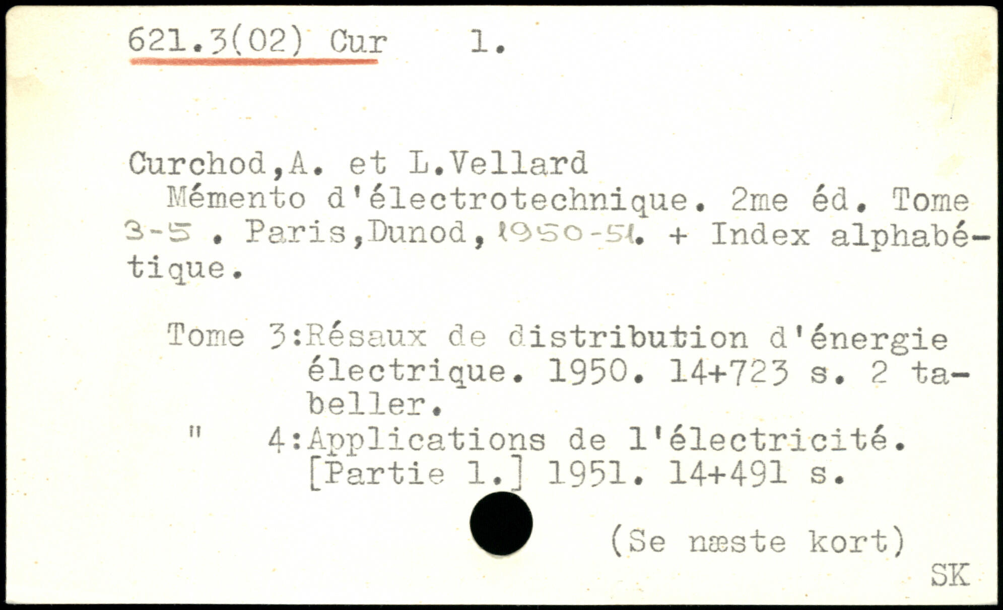 Mémento d’électrotechnique. 2me éd. Tome 3-s , Paris,Dunod, l9So:5i, + Index alphabétique. Tome 3:Pésaux de distribution d’énergie électrique. 1950.