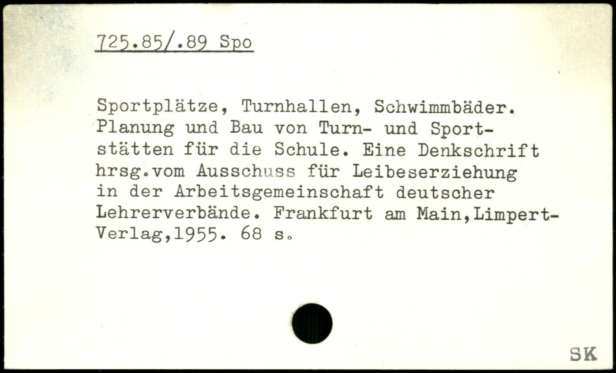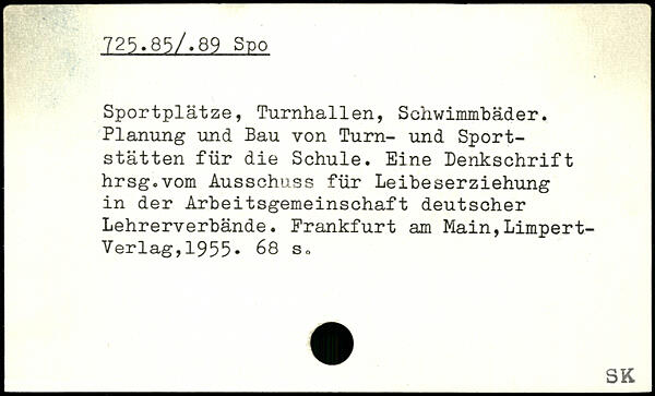 Sportplätze, Turnhallen, Schwimmbäder. Planung und Bau von Turn- und Sportstätten für die Schule. Eine Denkschrift hrsg.vom Ausschuss für Leibeserziehung in der Arbeitsgemeinschaft deutscher Lehrerverbände.