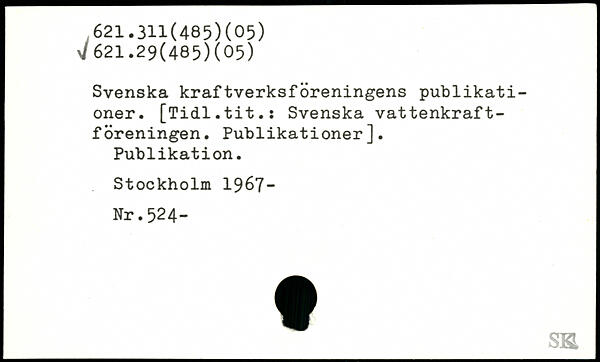 Svenska kraftverksföreningens publikationer. [Tidl.tit.: Svenska vattenkraftföreningen. Publikationer]. Publikation.