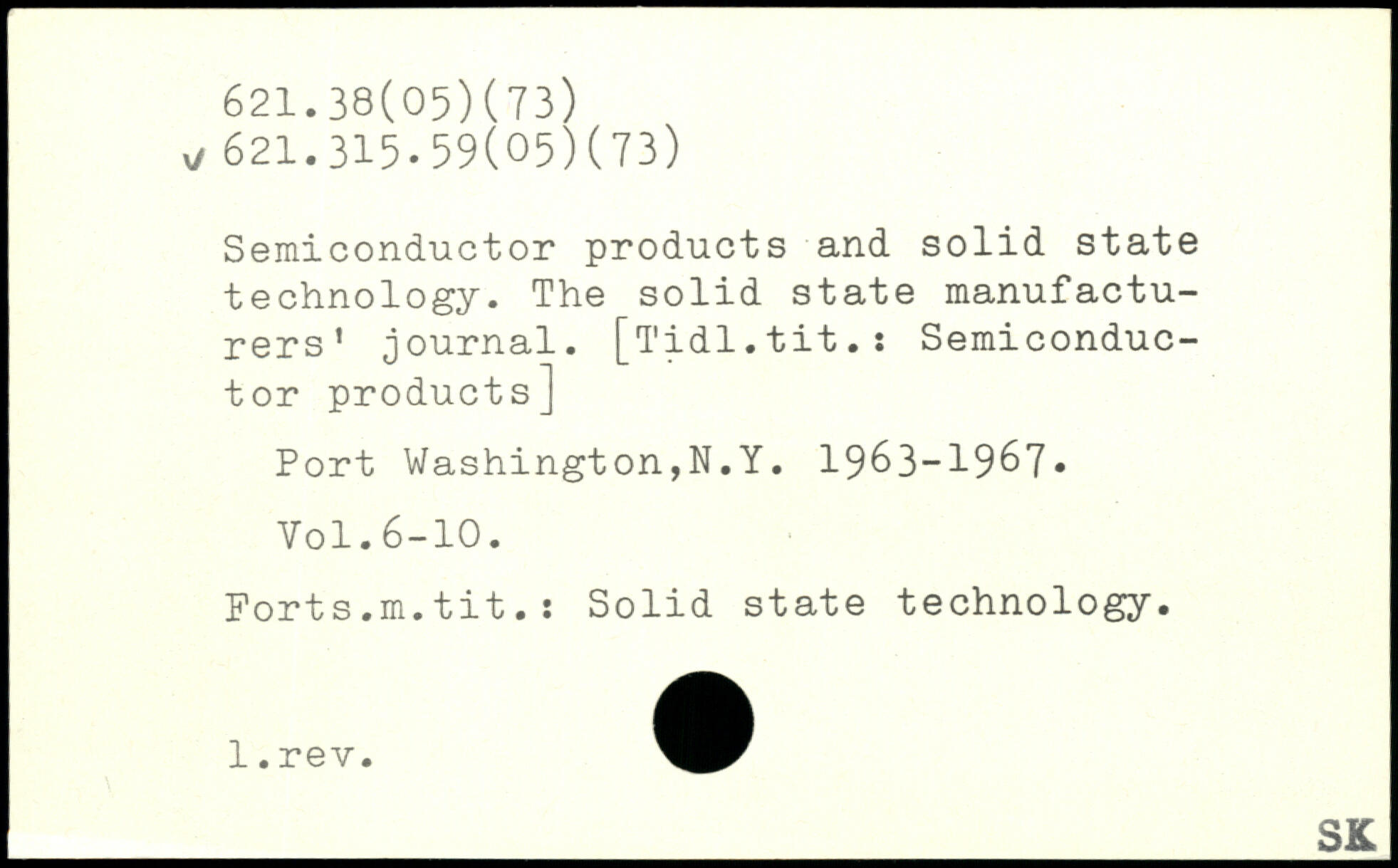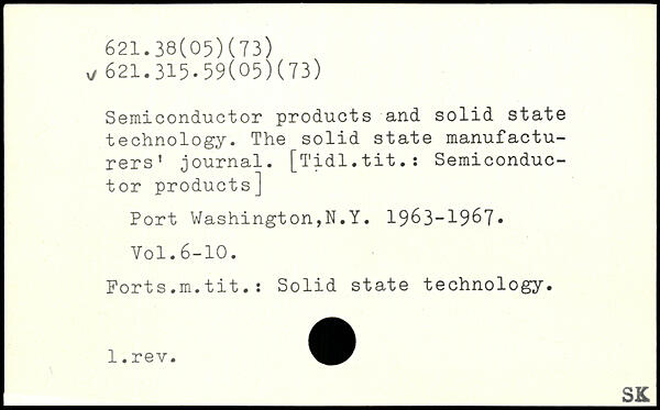 Semiconductor products and solid state technology. The solid state manufacturers’ journal. [Tidl.tit.: Semiconductor products] Port Washington,N.Y. 1963-1967, Yol.6-10. Forts.m.tit.: Solid state technology. _