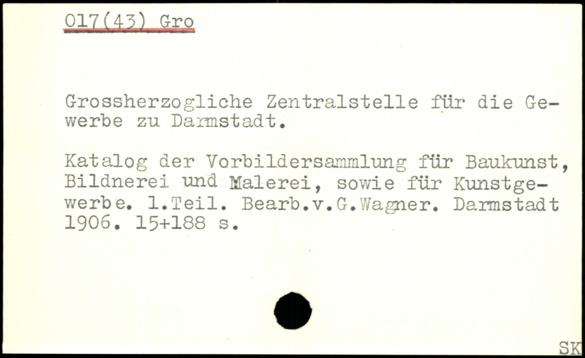 Grossherzogliche Zentralstelle für die Gewerbe zu Darmstadt, Katalog der Vorbild er Sammlung für Baukunst, Bildnerei und Malerei, sowie für Kunstgewerbe, l.Teil. Bearb,V.G,Wagner. Darmstadt 1906.