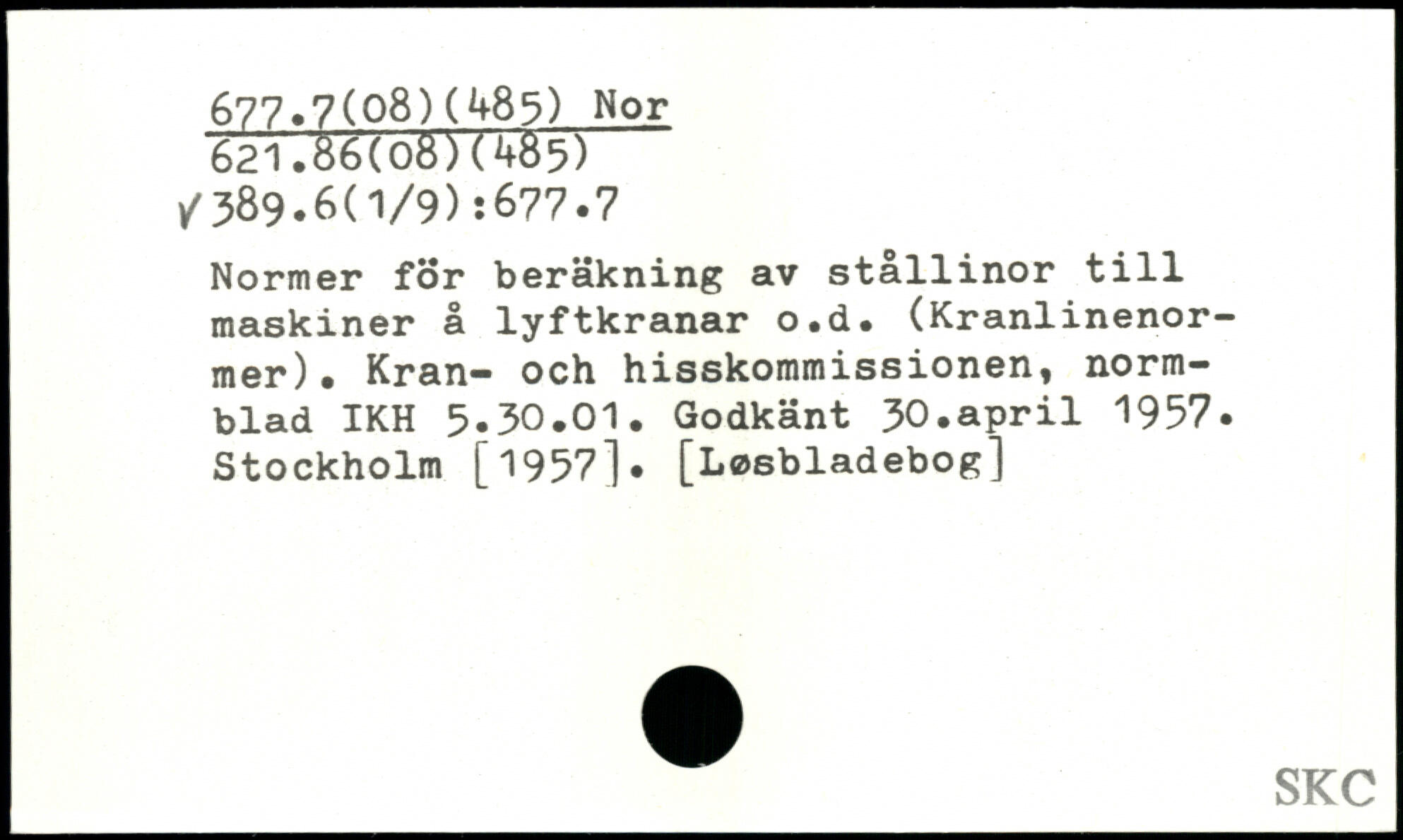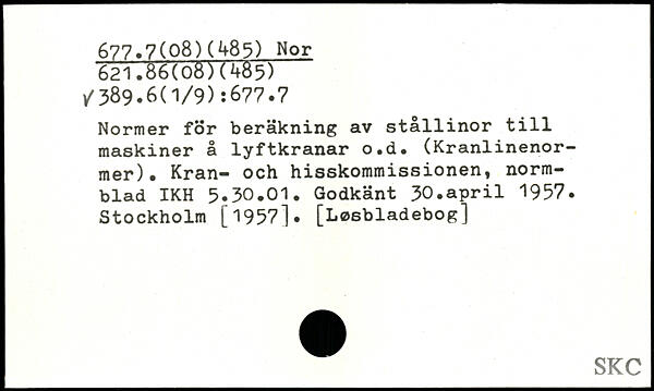 Normer för beräkning av stållinor till maskiner å lyftkranar o.d. (Kranlinenor-mer). Kran- och hisskommissionen, normblad IKH 5.30.01. Godkänt 30.april 1957.