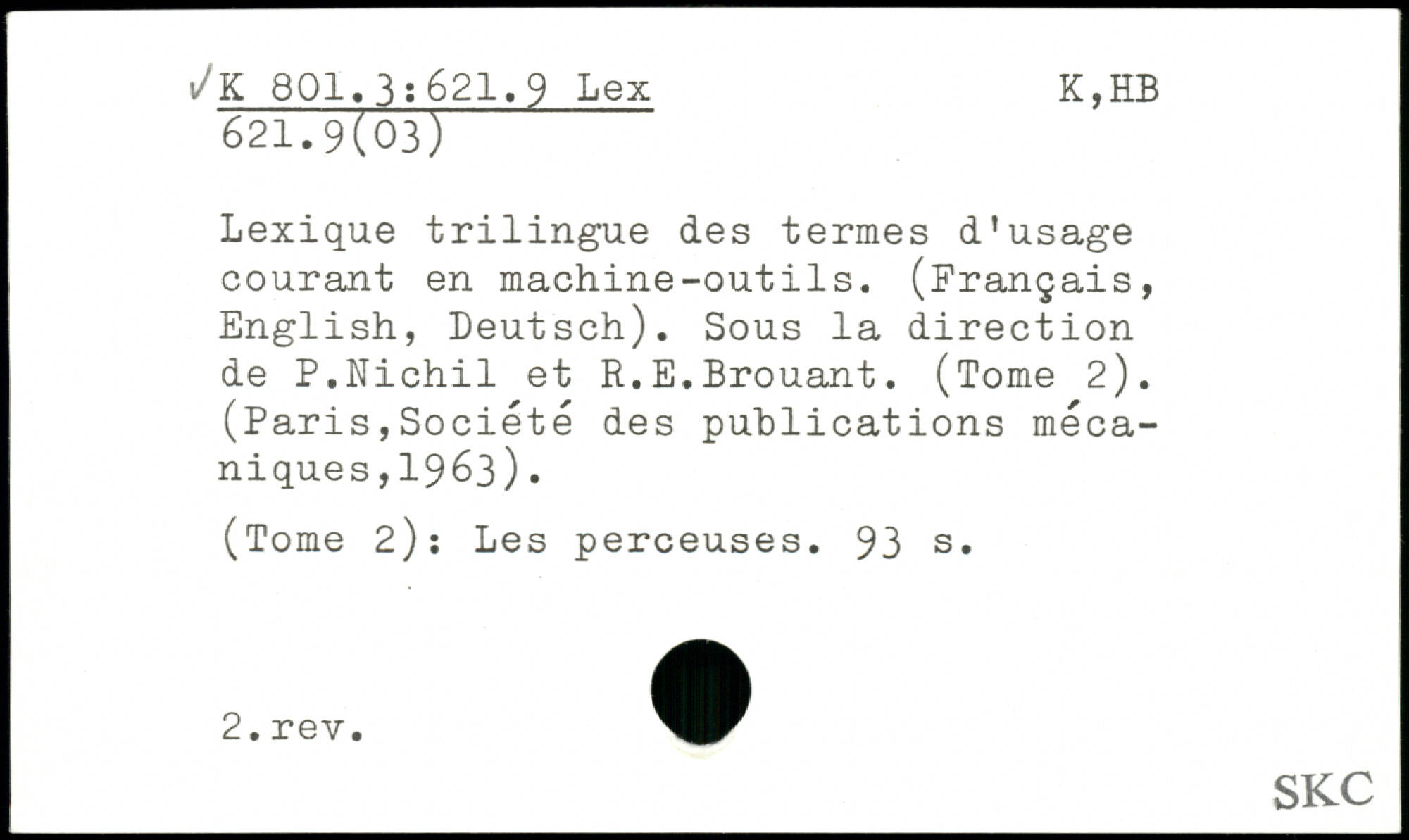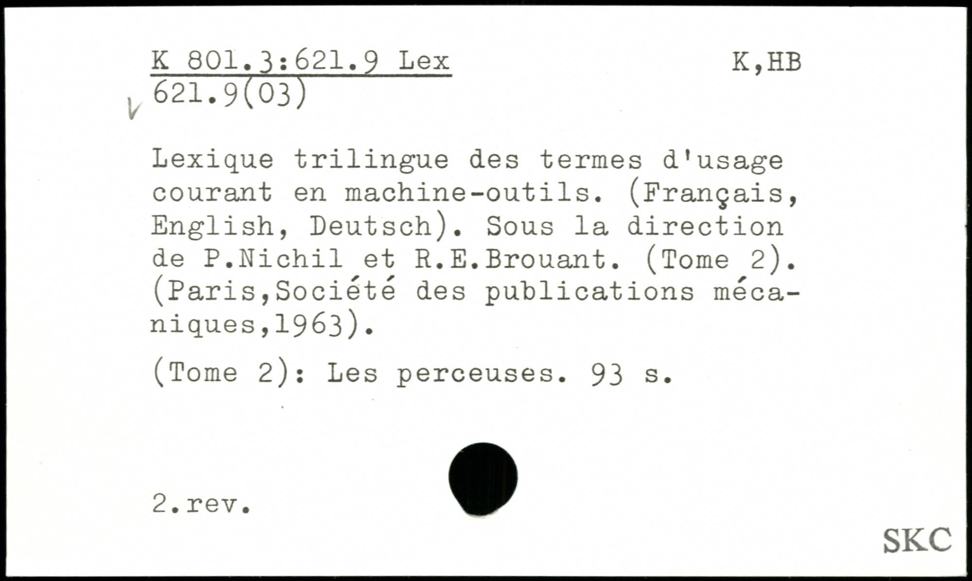 Lexique trilingue des termes d'usage courant en machine-outils. (Français, English, Deutsch). Sous la direction de P.Nichil et R.E.Brouant. (Tome 2). (