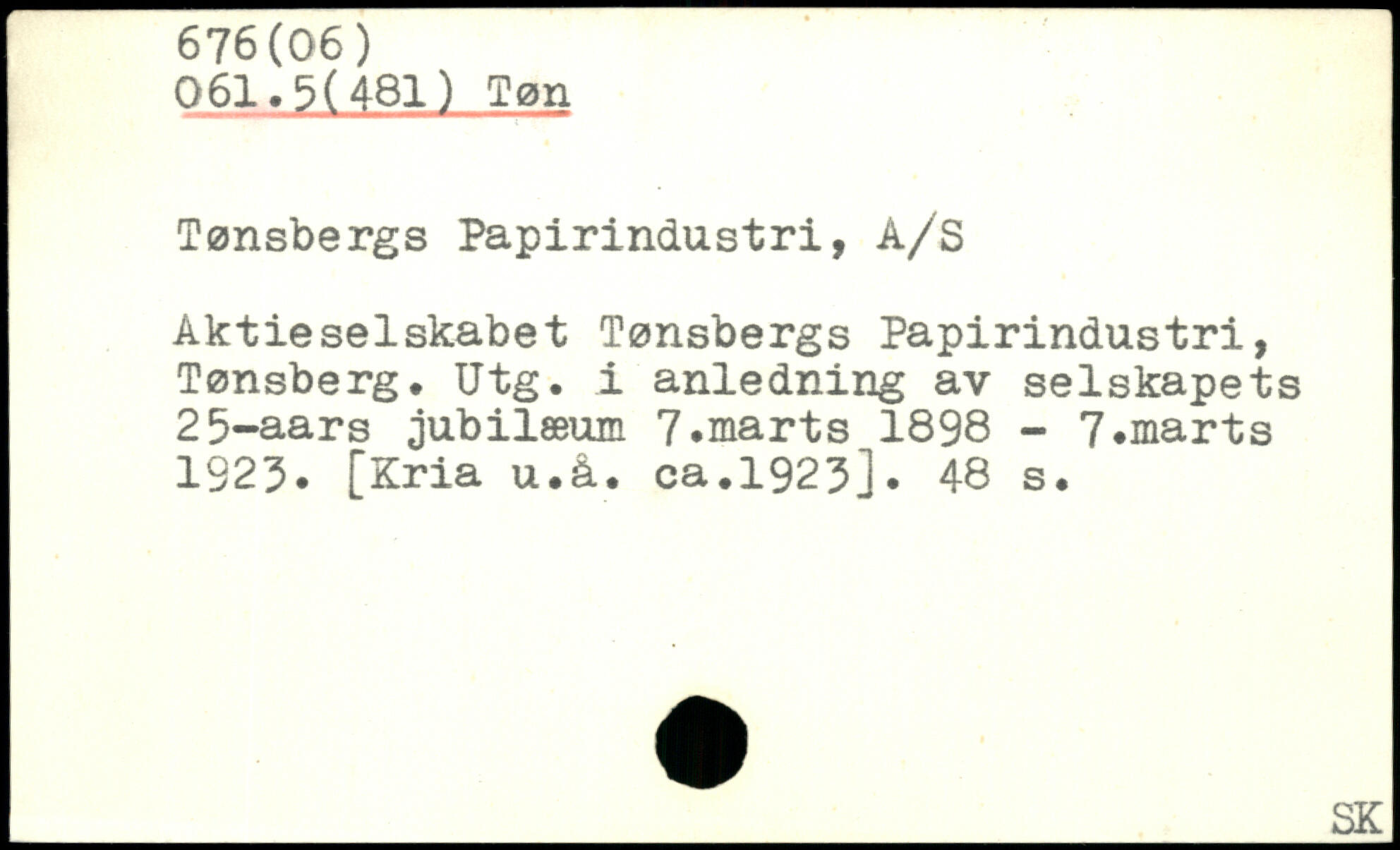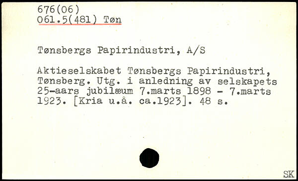 Tønsbergs Papirindustri, A/'S Aktieselskabet Tønsbergs Papirindustri, Tønsberg. Utg. i anledning av seiskapets 25-aars jubilæum 7.marts 1898 - 7.marts 1925. [Kria u.å. ca.1923].