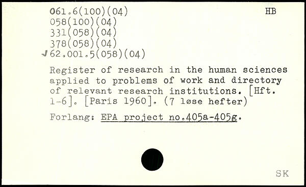 Register of research in the human sciences applied to problems of work and directory of relevant research institutions. [Hft. 1-6]0