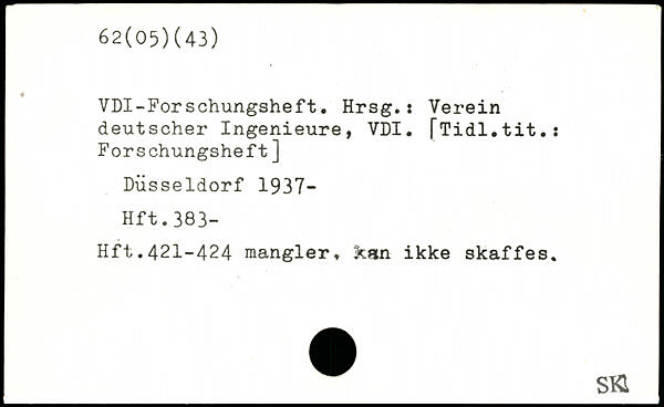 VDI-Forschungsheft. Hrsg.: Verein deutscher Ingenieure, VDI. TTidl.tit.: Forschungsheft] Düsseldorf 1937-Hft.383- Hft.421-424 mangler. kan ikke skaffes. SU