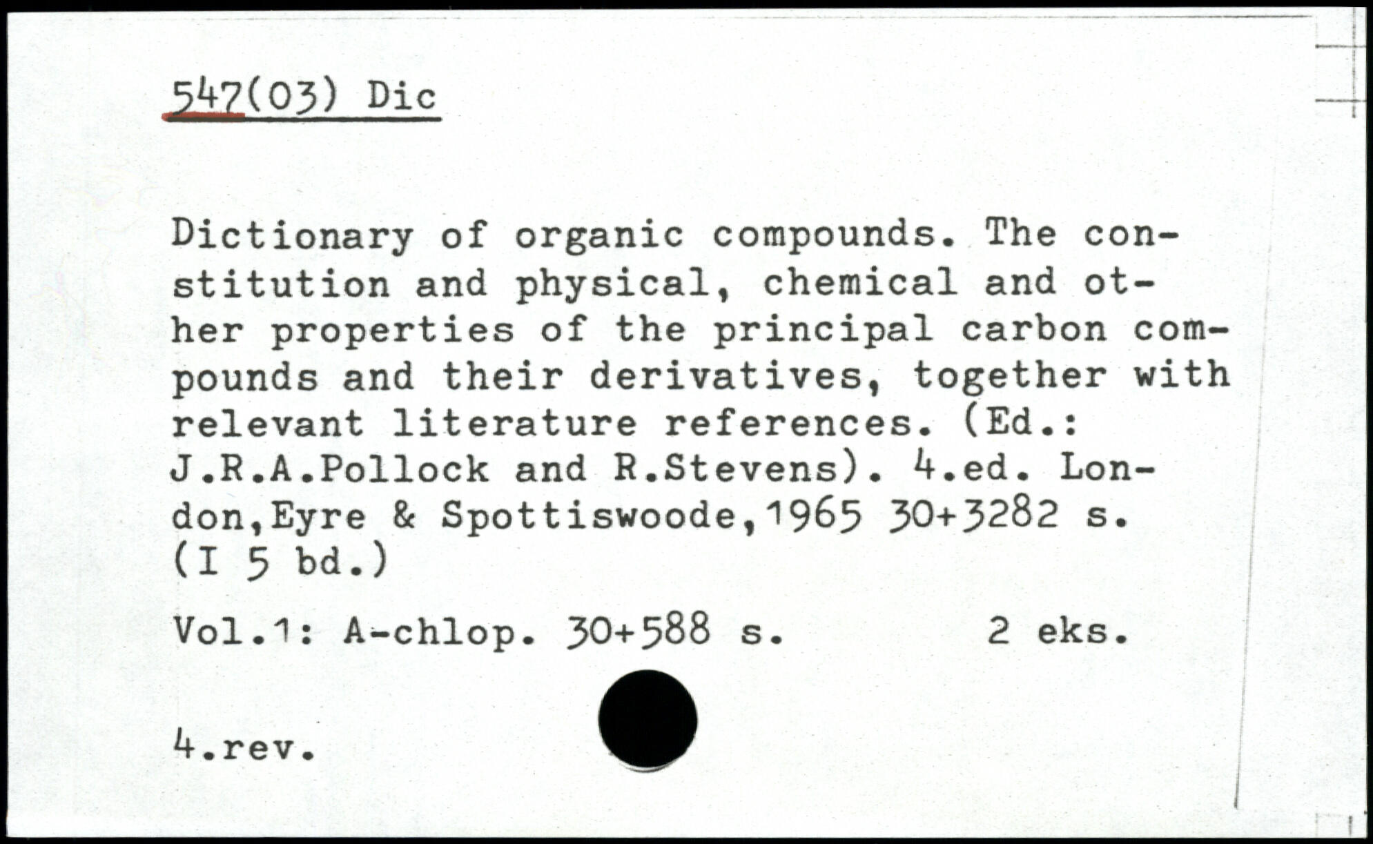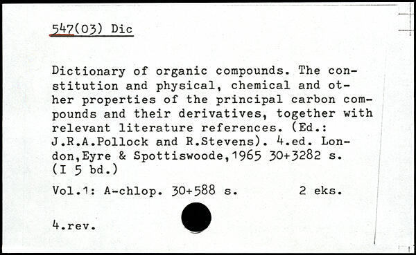 Dietionary of organic compounds. The constitution and physical, chemical and other properties of the principal carbon compounds and their derivatives, together with relevant literature references. (Ed.: J.R.A.Pollock and R.Stevens).