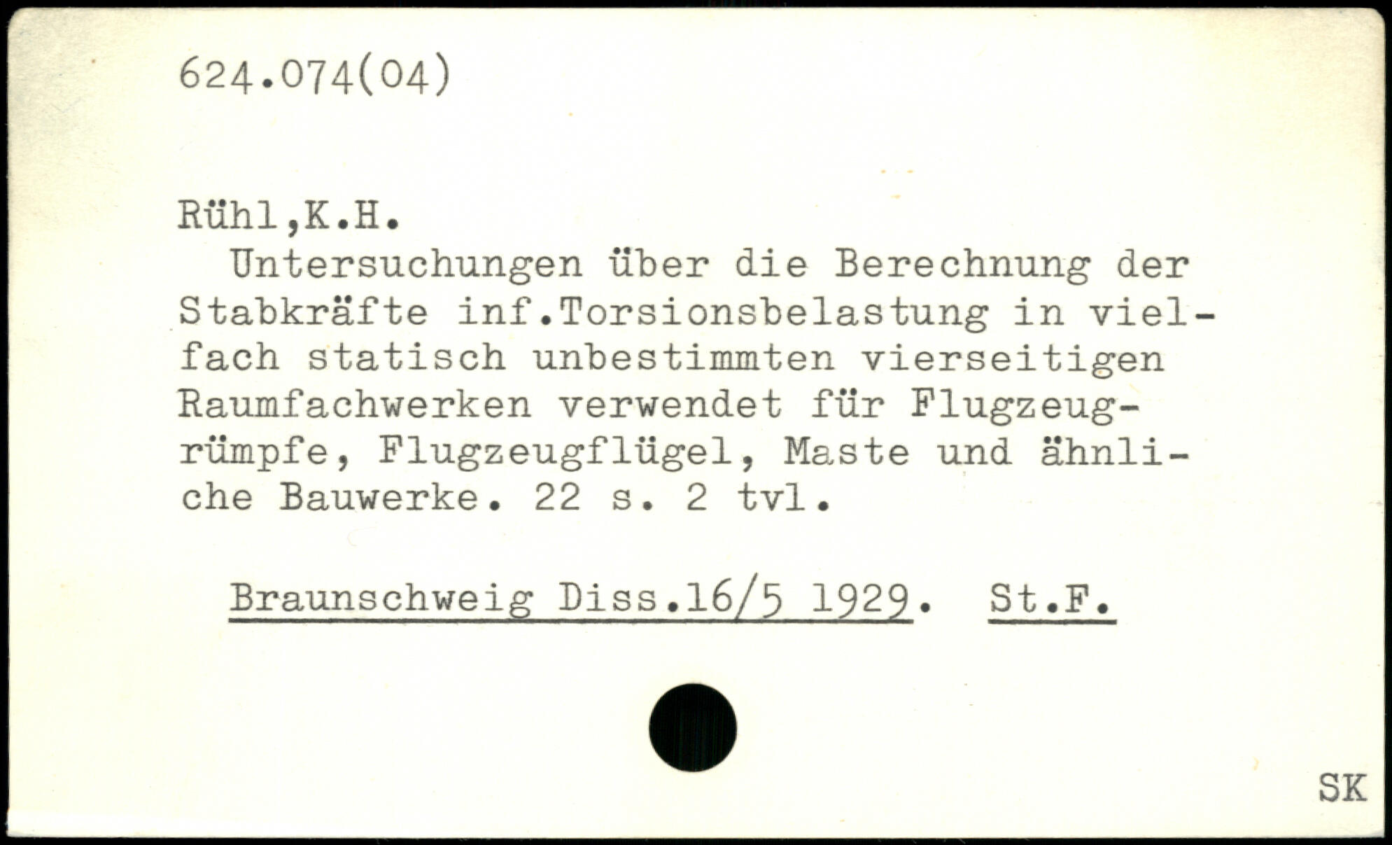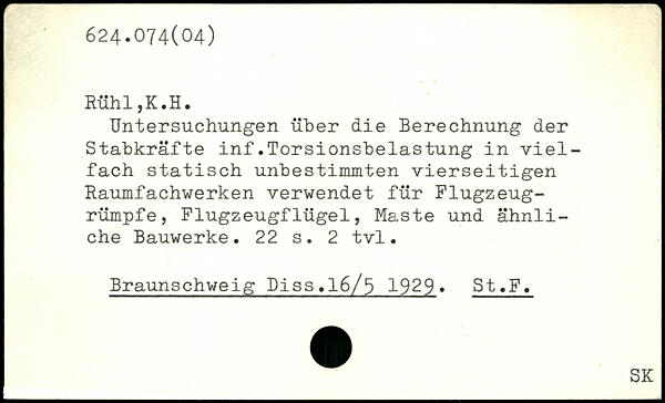 Untersuchungen über die Berechnung der Stabkräfte inf.Torsionsbelastung in vielfach statisch unbestimmten vierseitigen Raumfachwerken verwendet für Plugzeugrümpfe, Flugzeugflügel, Maste und ähnliche Bauwerke.
