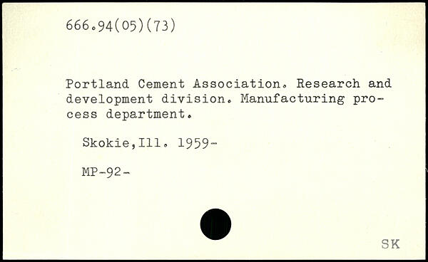 Portland. Cement Association. Research and development division. Manufacturing process department. Skokie,111. 1959- MP-92-
