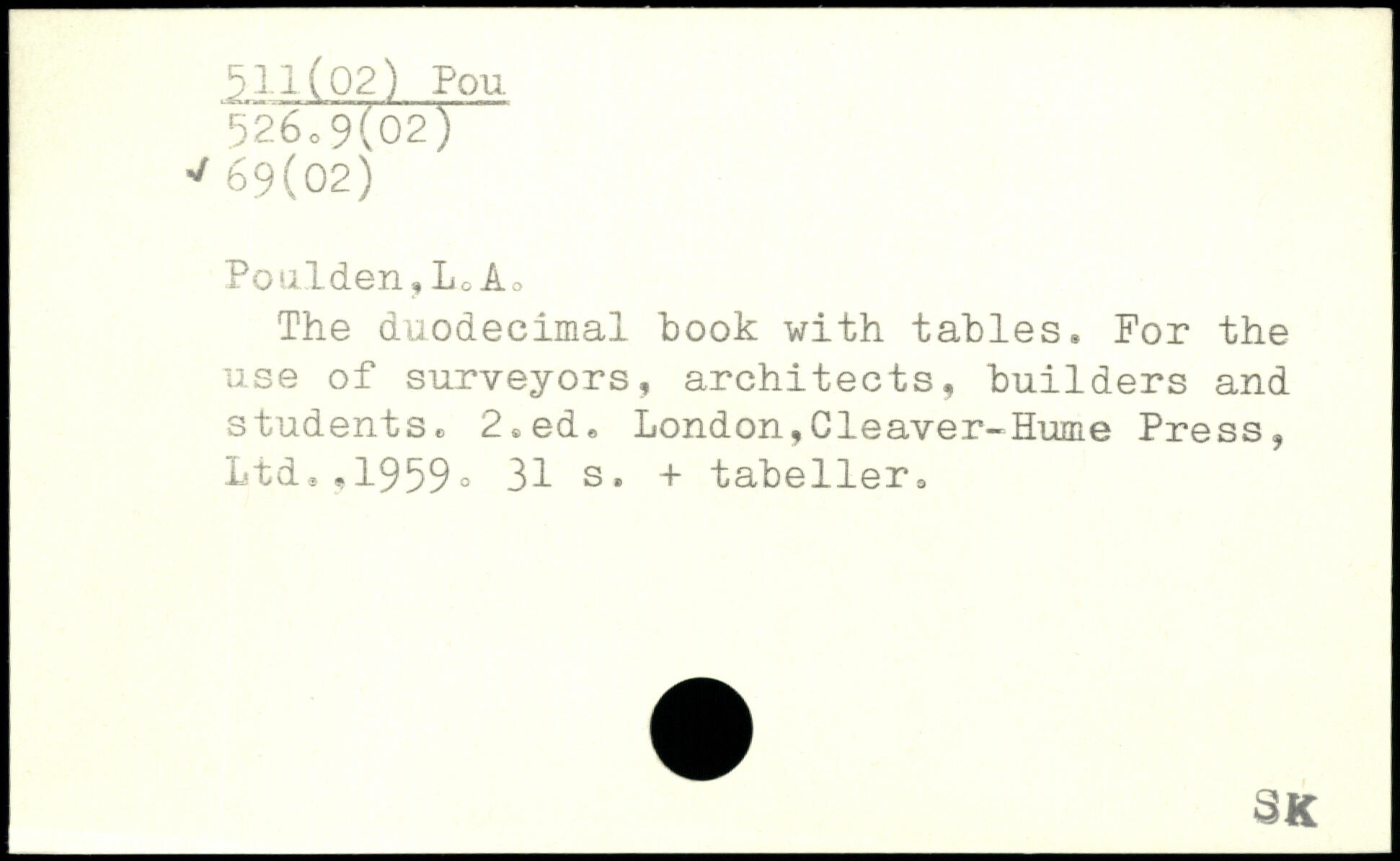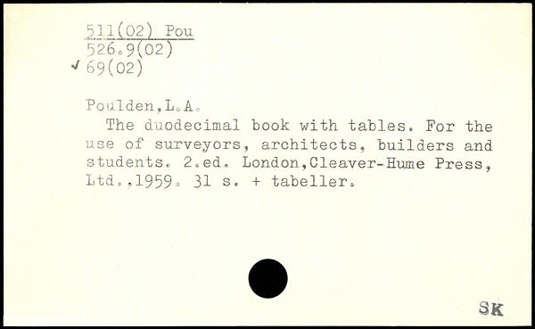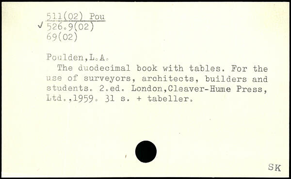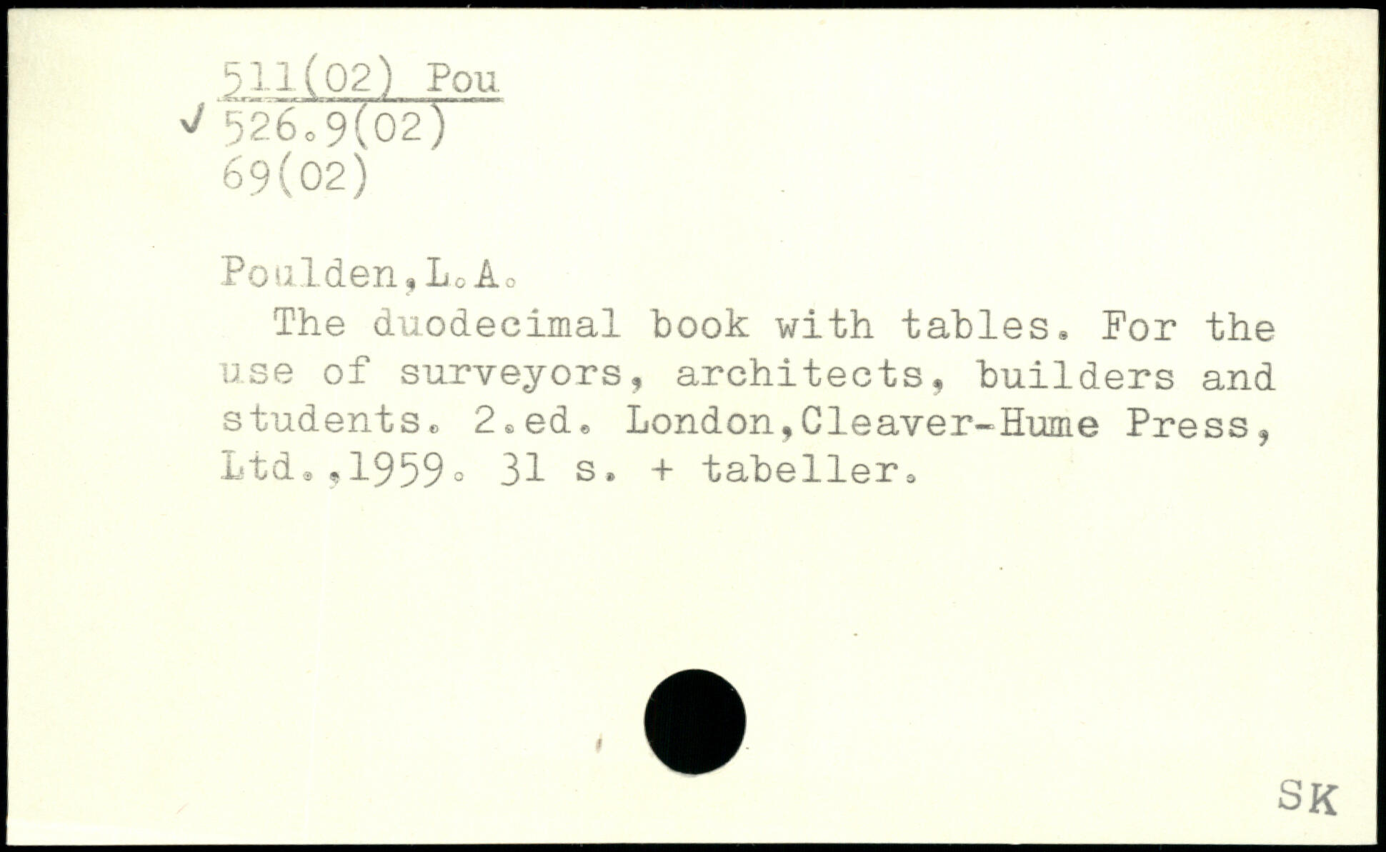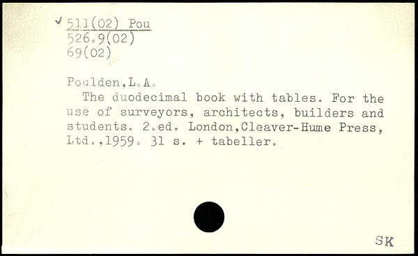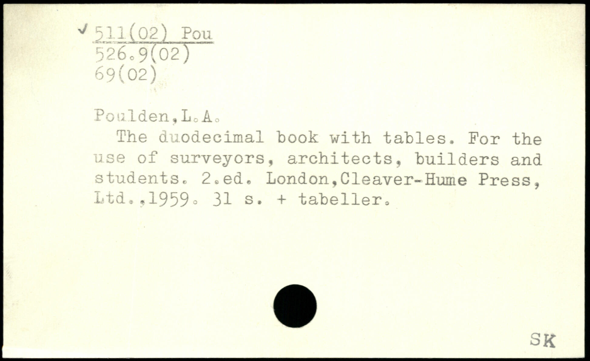 Poalden,LcAo The duodecimal hook with tables. For the use of surveyors, architects, builders and students, 2eed, London,Cleaver-Hume Press, Ltd,,1959.