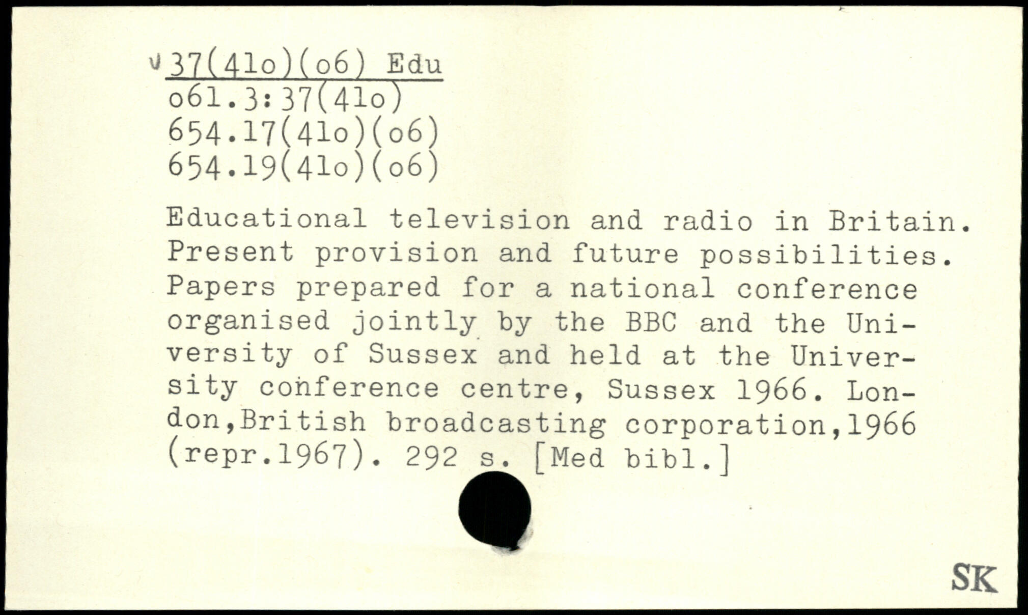 Educational television and radio in Britain. Present provision and future possibilities. Papers prepared for a national conference organised jointly by the BBC and the University of Sussex and held at the University conference centre, Sussex 1966.