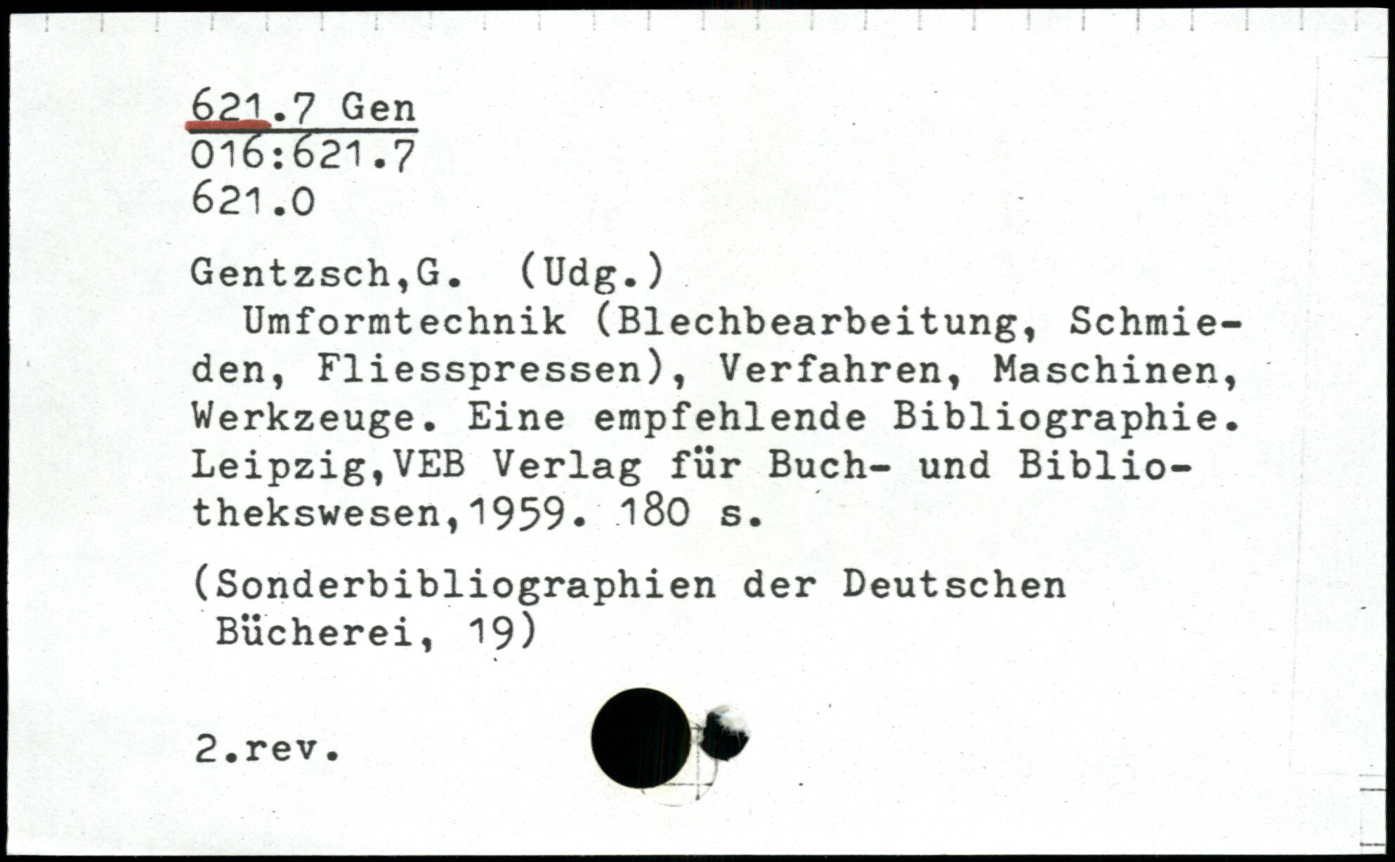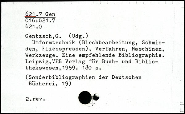 Umformtechnik (Blechbearbeitung, Schmieden, Fliesspressen), Verfahren, Maschinen, Werkzeuge. Eine empfehlende Bibliographie. Leipzig,VEB Verlag für Buch- und Bibliothekswesen, 1959.