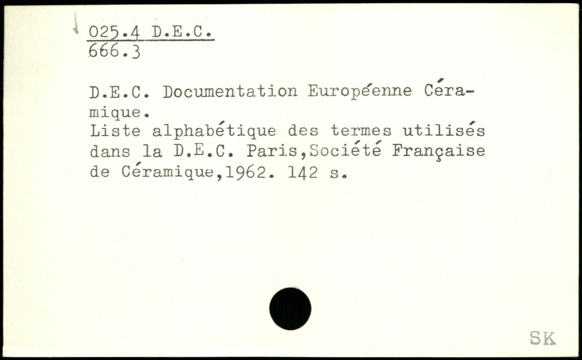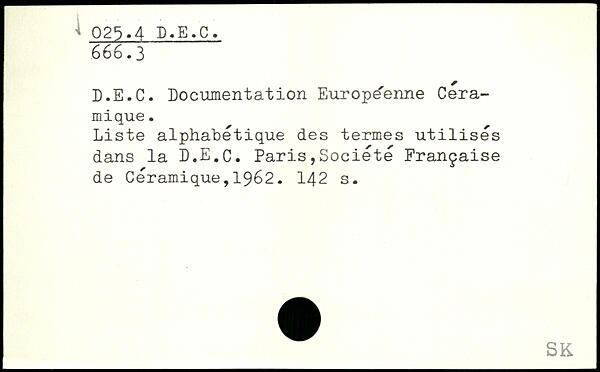 D.E.C. Documentation Europe'enne Céramique. Liste alphabétique des termes utilisés dans la D.E.C. Paris,Société Française de Céramique,1962.
