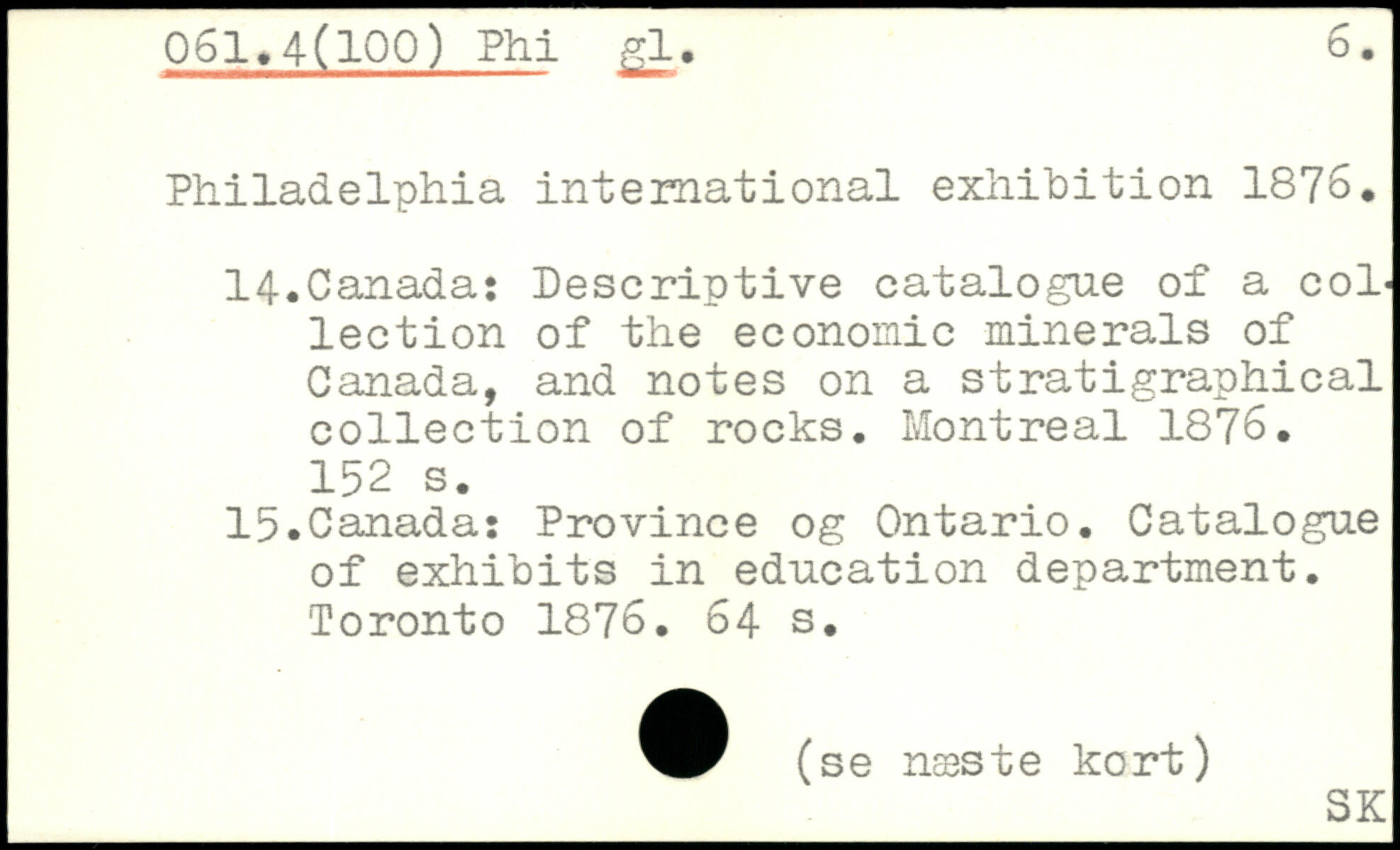 Philadelphia international exhibition 1876. 14. Canada: Descriptive catalogue of a col, lection of the economic minerals of Canada, and notes on a stratigraph!cal collection of rocks. Montreal 1876.