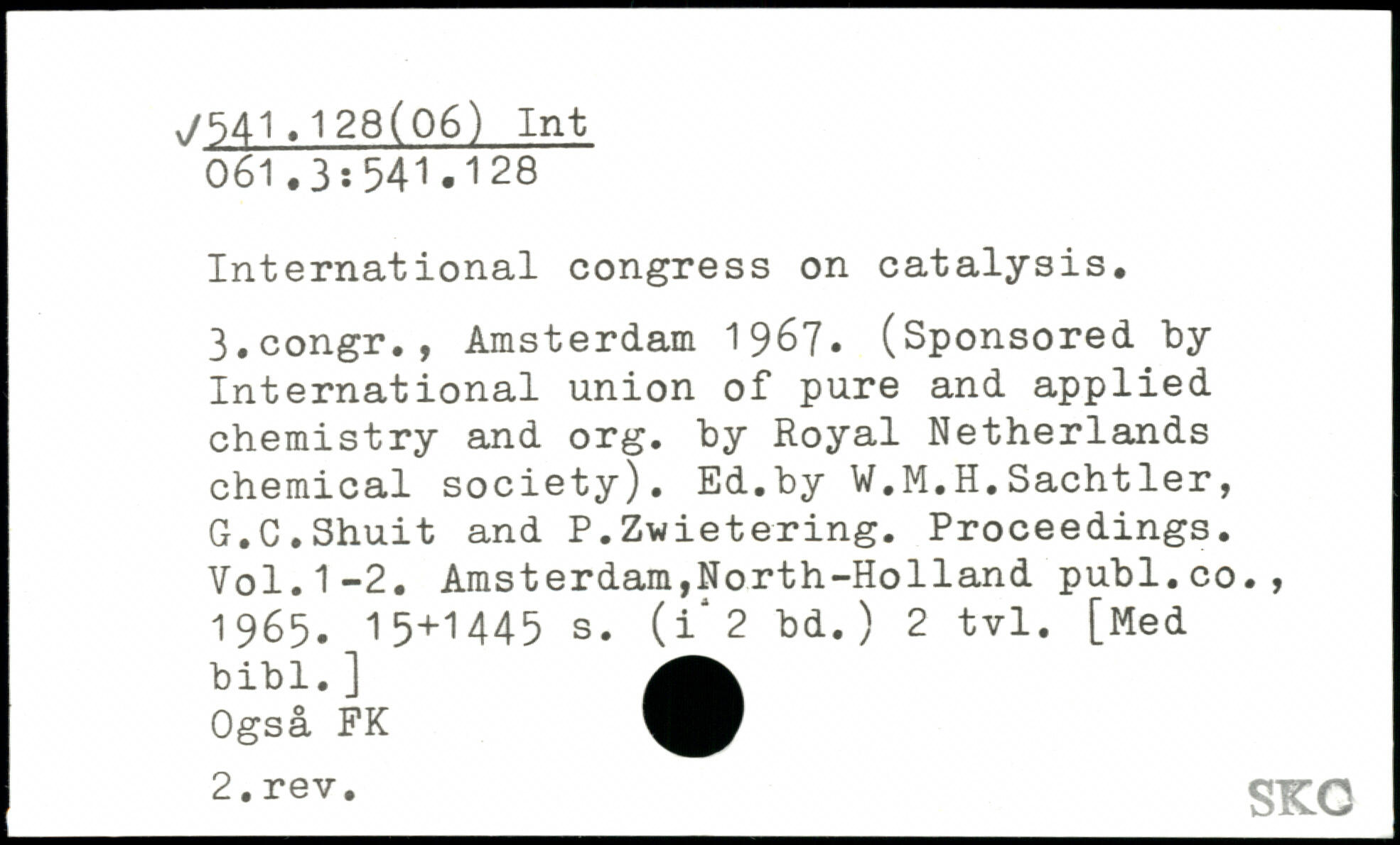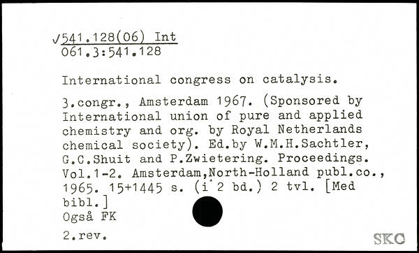 International congress on catalysis. 3.congr., Amsterdam 1967. (Sponsored by International union of pure and applied chemistry and org. by Royal Netherlands chemical society). Ed.by W.M.H.Sachtler, G.C.Shuit and P.Zwietering. Proceedings.