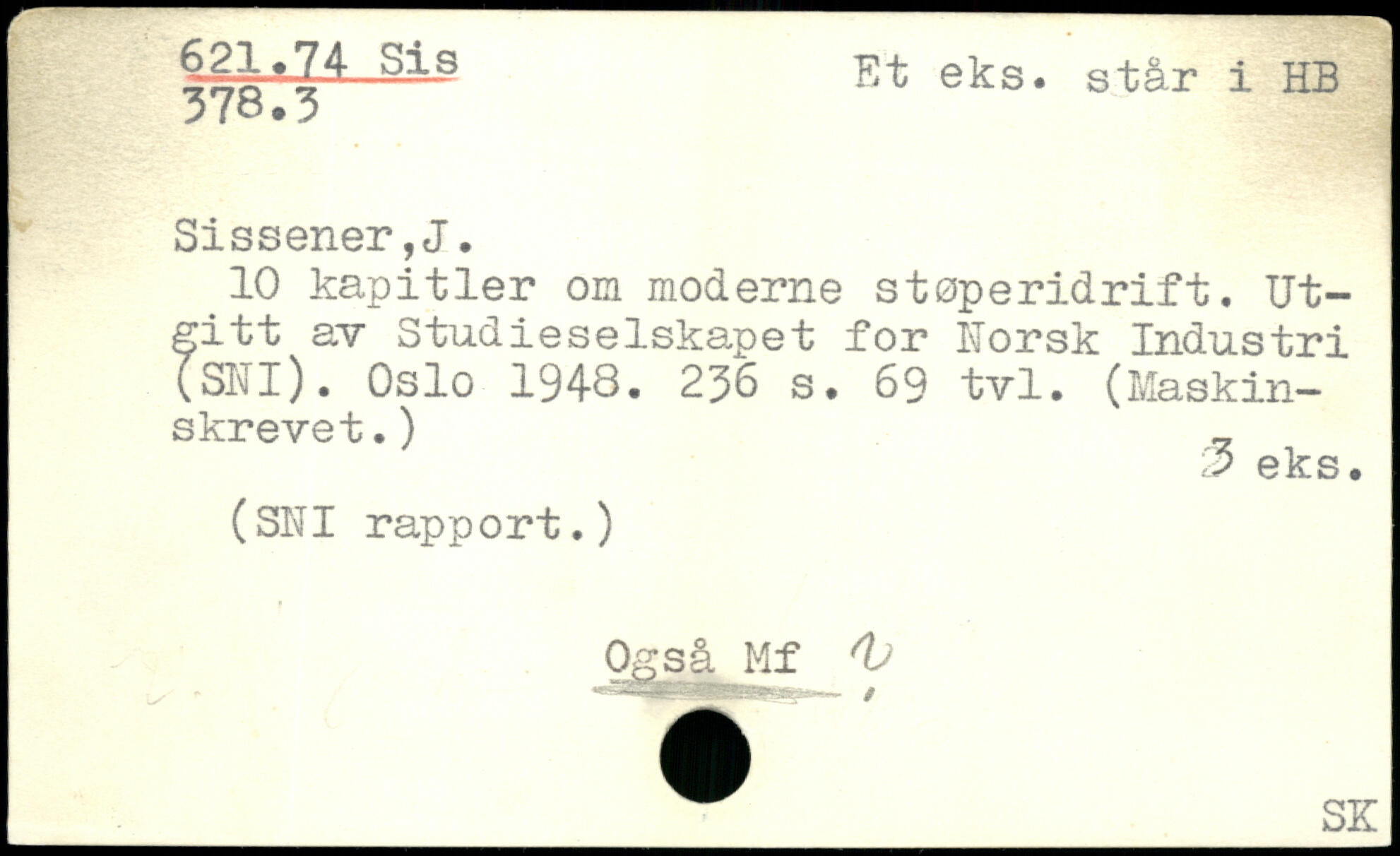 10 kapitler om moderne støperidrift. Ut-gitt av Studieseiskapet for Korsk Industri (SKI). Oslo 1948.