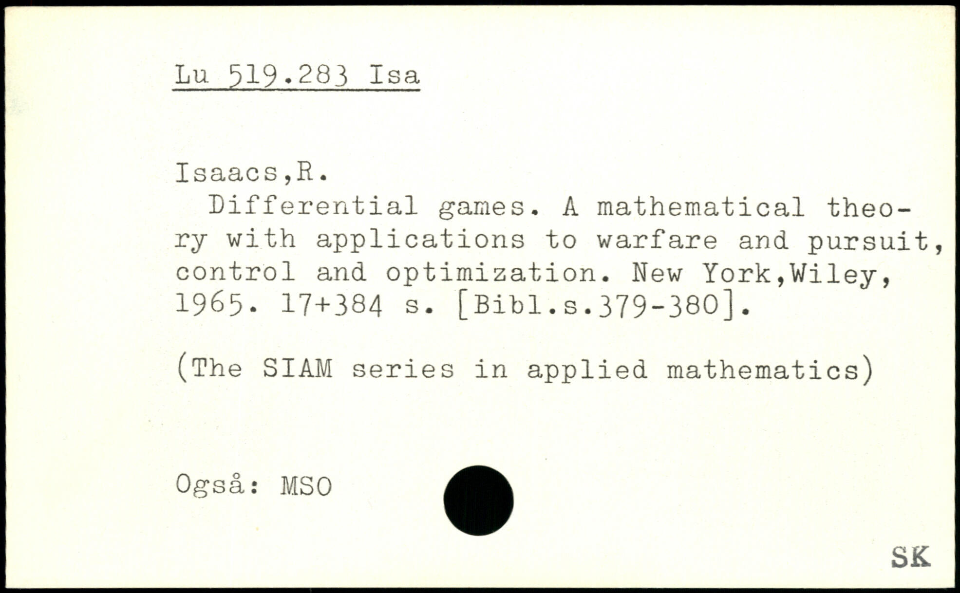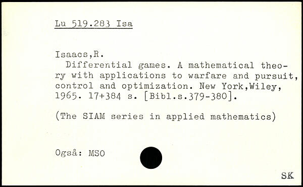 Differential games. A mathematical theory with applications to warfare and pursuit, control and optimization.