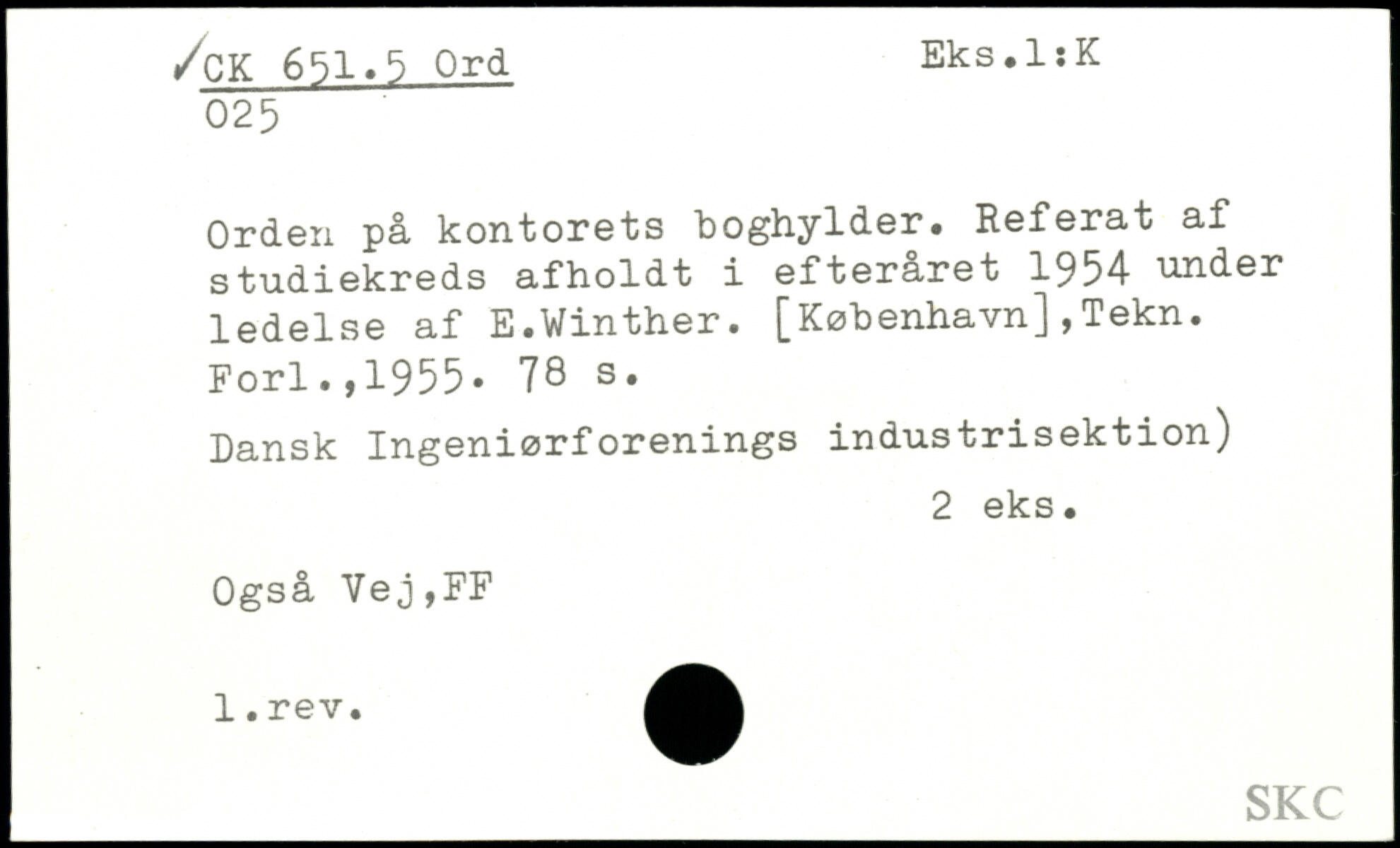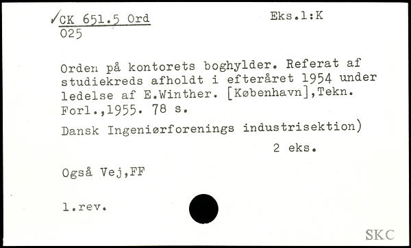Orden på kontorets boghylder. Referat af studiekreds afholdt i efteråret 1954 under ledelse af E.Vinther. [København],Tekn. Forl.,1955