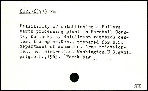 Feasibility of establishing a Fullers earth processing plant in Marshall County, Kentucky by Spindletop research center, Lexington,Ken., prepared for U.S. department of commerce, Area redevelopment administration. Washington,U.S.gvmt. prtg.off.,1965. [Forsk.pag.]