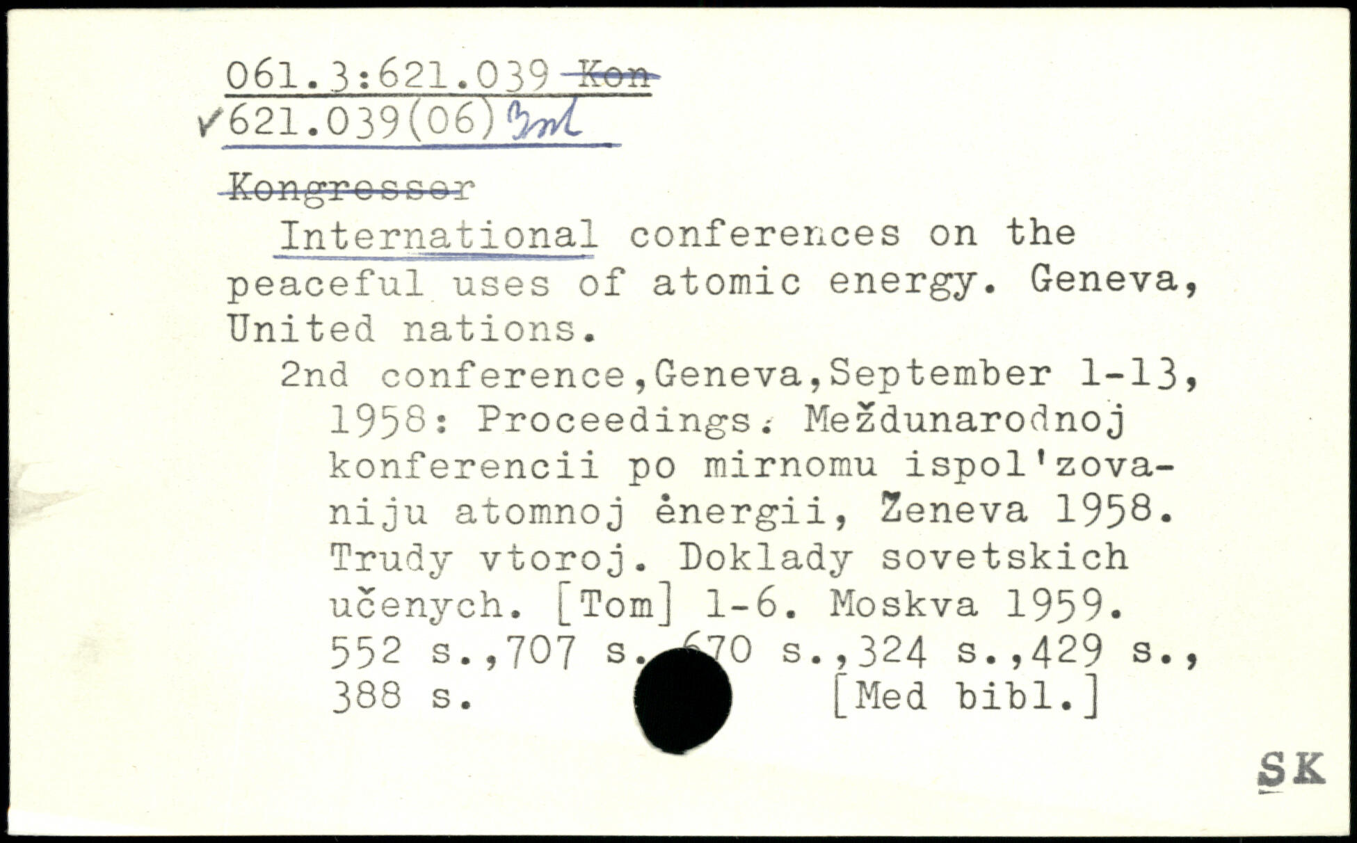 International conferences on the peaceful uses of atomic energy. Geneva, United nations. 2nd conference,Geneva,September 1-13, 1958’ Proceedingsi Mezdunarodnoj konferencii po mirnomu ispol'zova-niju atomnoj energii, Zeneva 1958-Trudy vtoroj. Doklady sovetskich ucenych. [Tom] 1-6.